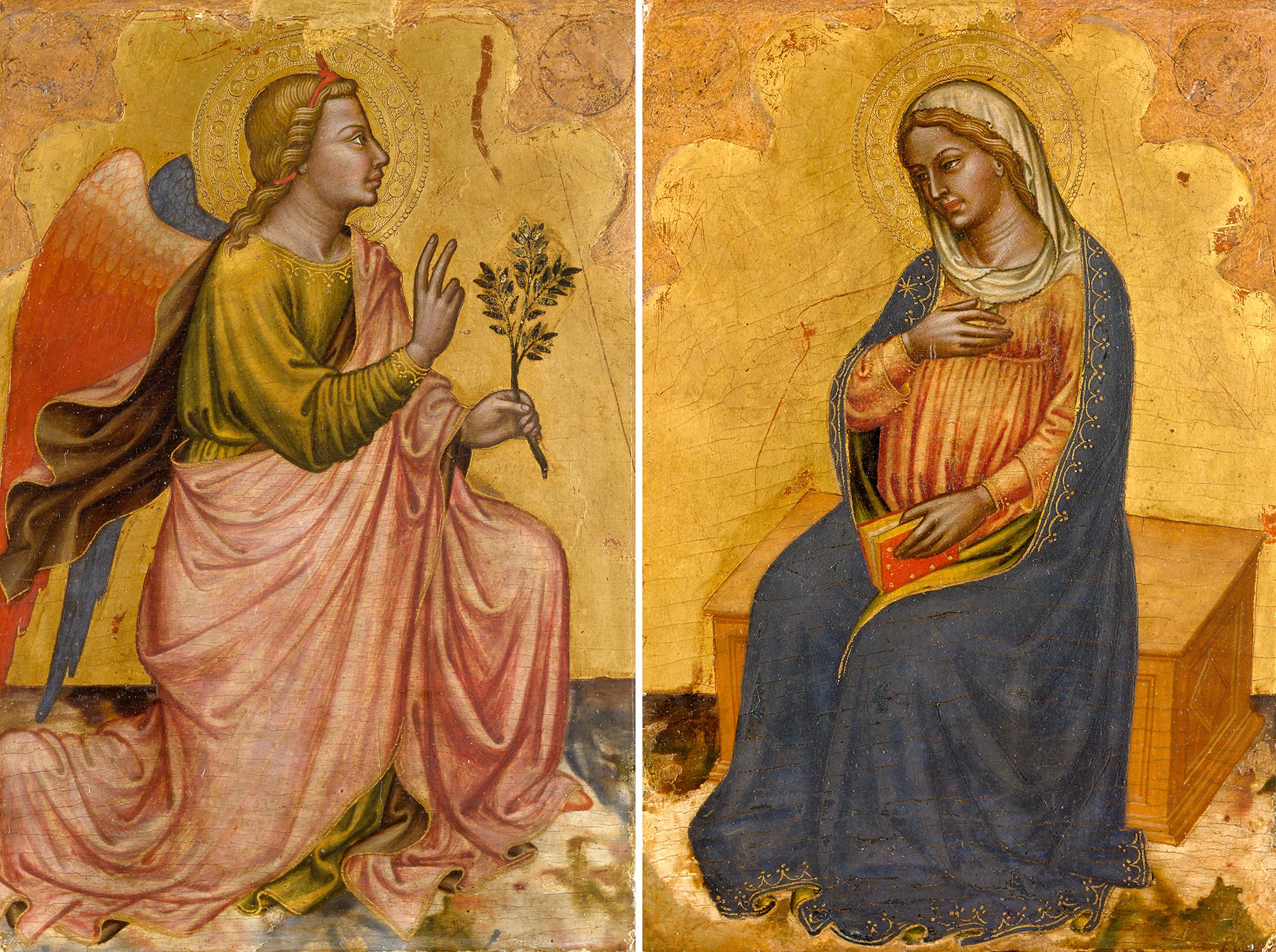 The panel support, of a vertical wood grain, has been thinned to between 5 and 9 millimeters in depth and cradled. It comprises four planks approximately 22.5, 21, 26, and 9.5 centimeters wide, from left to right, and it has been cropped across the top, where a 9-centimeter-tall addition of old wood completes the profile of the ogival arch. A triangular insert, 37 centimeters tall and 4.7 centimeters wide, compensates a loss of wood at the bottom-left corner. The two seams separating the first, second, and third planks are slightly open, provoking minor losses to the surface. The painting was aggressively cleaned by Andrew Petryn at an unknown date after 1970, which involved scraping away nearly the entirety of the Virgin’s blue mantle, heavily abrading the Magdalen’s red dress, and gouging out smaller local losses through the shadows in the gray robe of the Holy Woman standing at the left. The gold is heavily worn. Irregular losses across the bottom of the panel may be due to water damage, and the original pastiglia cusps defining the upper profile of the composition were probably shaved away before James Jackson Jarves acquired the painting in the 1850s. Much of the figural group in the right half of the painting is beautifully preserved.