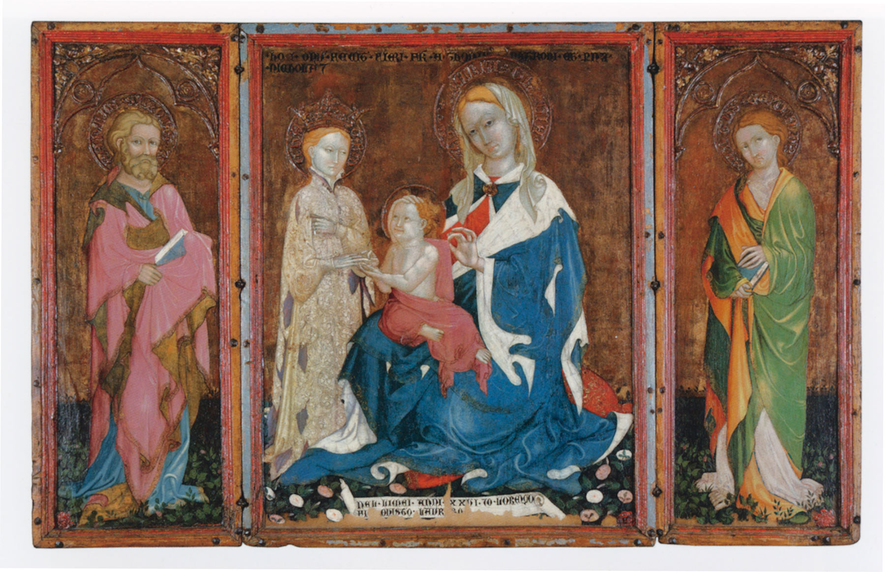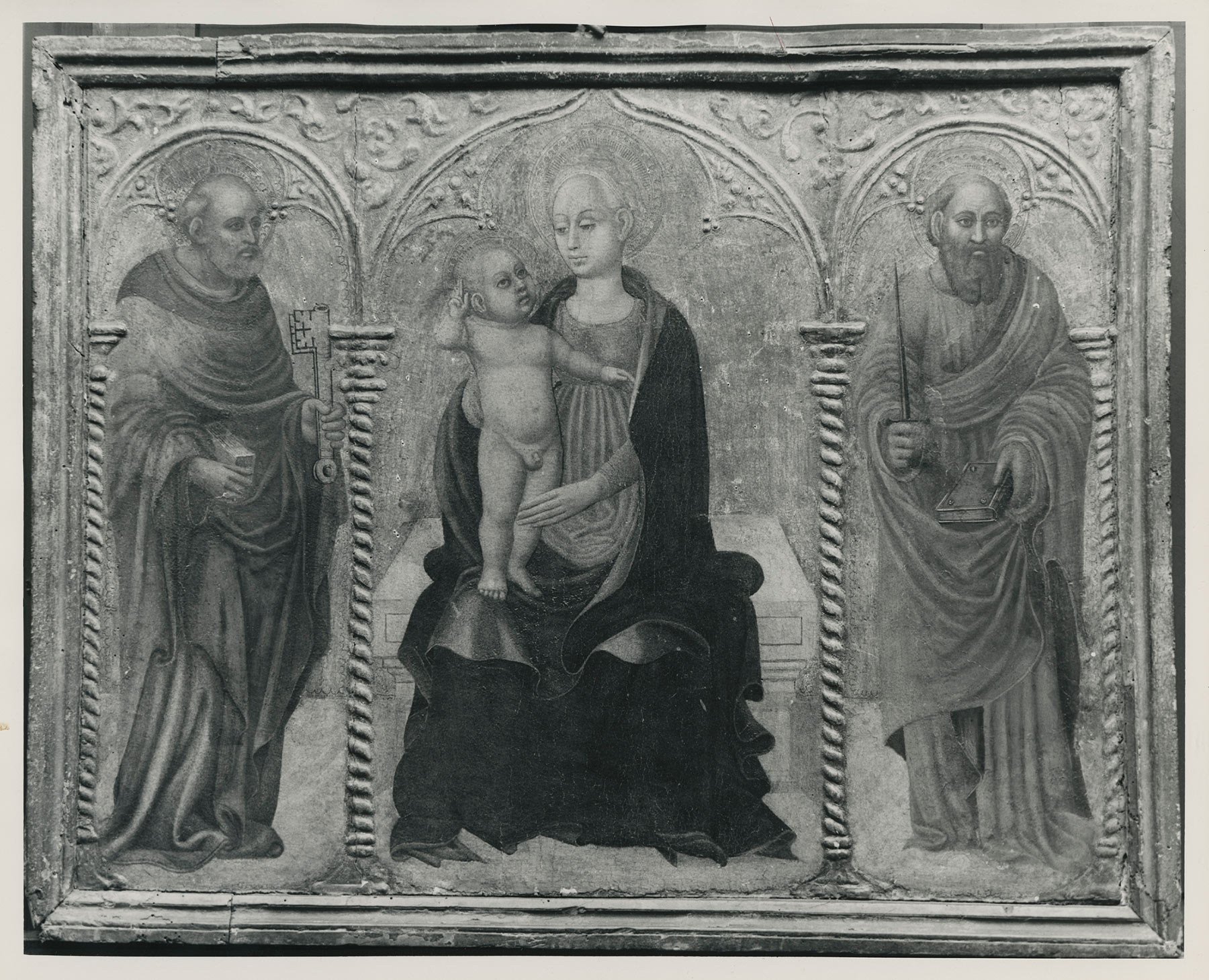 The triptych, which retains its original structure and format, is built of three vertical panels enclosed in a simple rectangular engaged frame. Spiral colonnettes and arches in raised pastiglia articulate the division between the compartments. Modern restorations and abrasions to the painted surface have greatly compromised the legibility of the figures, which were still intact, although possibly altered by modern retouches when the picture first entered Yale’s collection (fig. 1). In the center is the Virgin seated on a simple marble throne, with the blessing, naked Christ Child standing on her lap. She wears a blue robe lined with green over what appears to have been a pink dress. The standing saints on either side of the Virgin are reduced to no more than a shadow of the original. Saint Peter, in the position of honor on the Virgin’s right, is enveloped in what looks like a yellow-and-green cloak; Saint Paul, on her left, seems to be wearing a cloak lined in green over a scarlet tunic. Elaborate pastiglia decoration fills the spaces between the arches enclosing the figures. On the reverse is evidence of a rope hanger, suggesting that the picture was originally suspended against a wall or other structure—such as a rood screen or church pier—rather than placed on an altar.