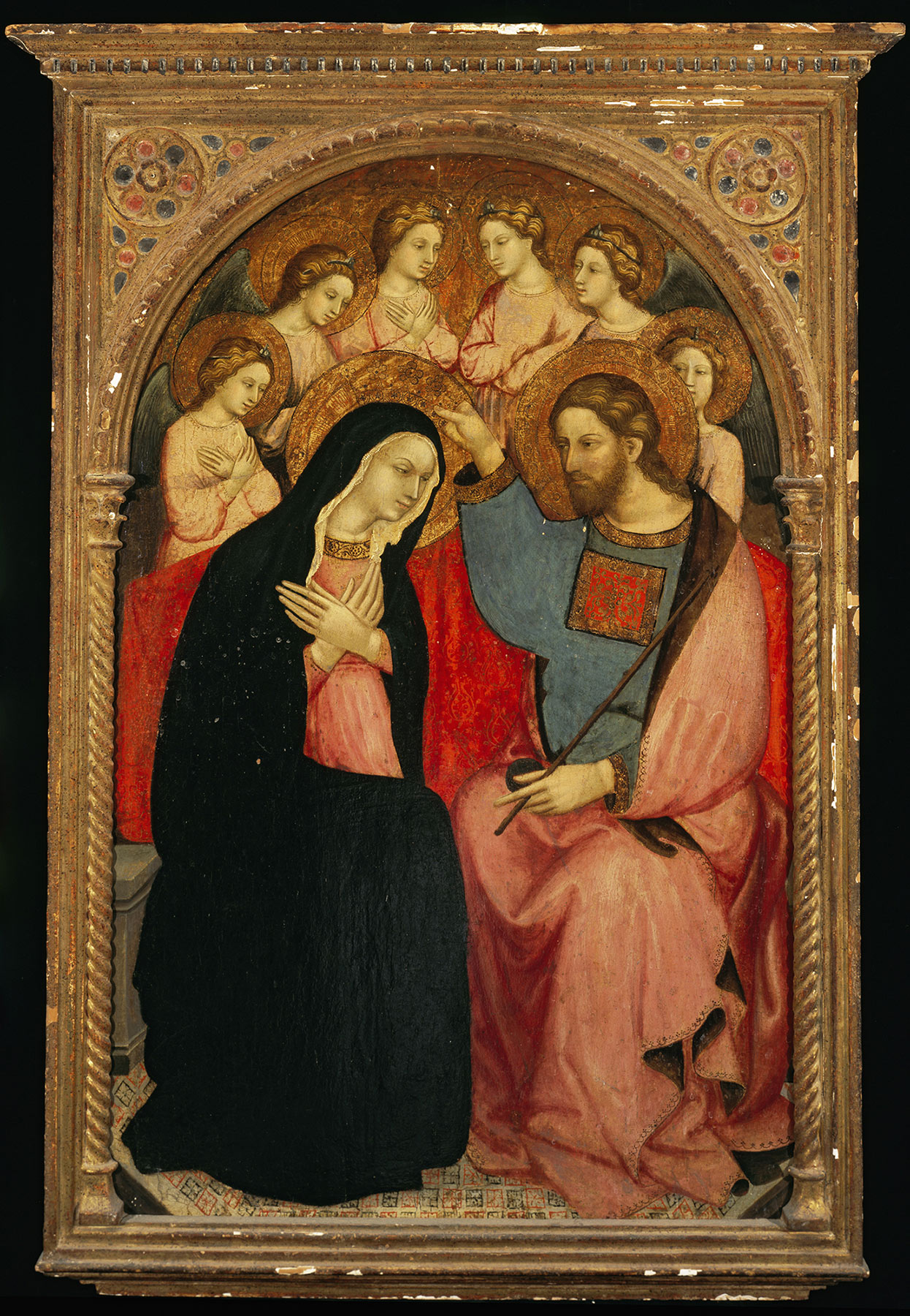 Stylistically, the closest analogies for the Yale triptych are to be found in the production of early fifteenth-century Marchigian painters active along the Adriatic coast in and around Ancona, where personalities such as Olivuccio di Ciccarello—who appears to have specialized in the technique of pastiglia work—developed an eclectic style with Bolognese derivations that has sometimes been considered in opposition to the florid, courtly tendencies of the Salimbeni brothers.8 Olivuccio’s activity coincided with that of his perhaps slightly older contemporary Pietro di Domenico da Montepulciano, an enigmatic personality with possible ties to Venice, who is documented as residing in Ancona in 1421 and who operated primarily between Ancona and Fermo in the 1410s and 1420s.9 It is tempting to view Frinta’s identification of Pietro di Domenico’s punch tool in the Yale painting as evidence of a workshop relationship. Several aspects of the present composition invite comparison with those pictures generally associated with Pietro’s activity before 1420, beginning with the small Virgin and Child in the Landesmuseum, Hannover, Germany,10 which shares the unusual shape of the pastiglia arch enclosing the figures and is usually dated between around 1415 and 1418. Further analogies can be drawn between the Virgin in the Yale panel and the Virgin and attendant angels in the slightly later Washington Coronation (see fig. 2), which present almost identical morphological traits and include the same punching and tooling in the haloes.11 Other features of the Yale painting, however, remain problematic. Above all, it is difficult to judge the extent to which the modern repaints visible in old photography might or might not reflect the original appearance of the two lateral saints, who seem at odds with Pietro’s approach. These elements, along with the hybrid nature of Marchigian painting in general, limit the extent to which one can draw definitive conclusions about the work’s authorship. —PP