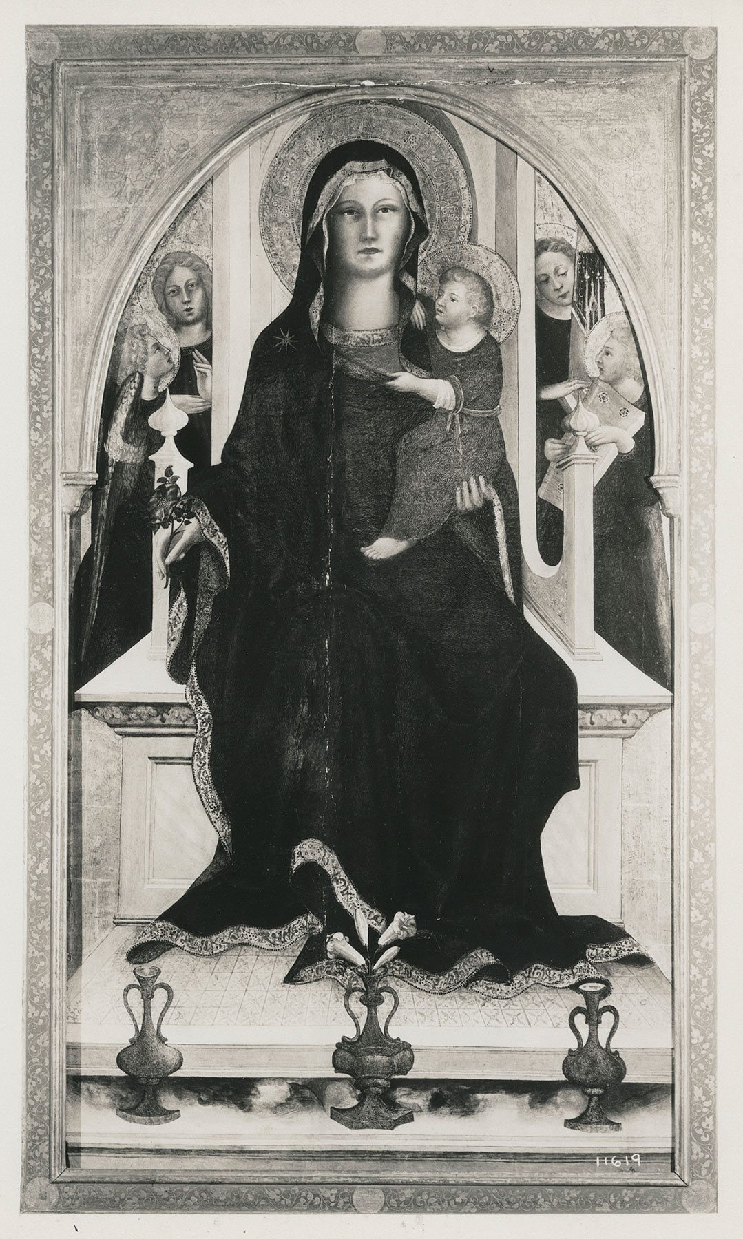 The painting, now reduced to a shadow of its former qualities, first appeared on the art market in Munich in 1921. Photographs taken at the time already show the longitudinal crack in the panel and extensive retouches resulting from previous restorations (fig. 1). Completely repainted at the time were the heads of the Christ Child and of the two angels in profile in the foreground, as well as the face of the angel playing a portative organ on the right. The head of the Virgin appears less heavily altered in the photographs, except where the vertical crack runs through the side of her face. It is difficult to see the extent to which the draperies of the figures and red wings of the angels were also repainted: judging from the flat surface of the Child’s gown, it may be presumed that losses in the original glazes extended to other areas. Still discernible at present is the imposing, solidly constructed marble throne with a raised dais embellished with a geometric gold pattern. Lined up along a red-and-green marbleized platform are three tall gilt vases, the one in the center containing the single stem of a white lily. The exquisite rendering of the elegantly shaped vessels, in which the appearance of three-dimensionality is achieved through the subtle application of glazes over a granulated gold surface, is an indicator of the technical sophistication that most likely once characterized the entire picture. The strongest evidence of the dazzling quality of the original image, however, lies in the technique employed by the artist in the figures’ draperies, where the color was applied over a layer of silver leaf incised with small parallel strokes following the direction of the folds. The silver would have lent a cool luminosity to the blue pigment of the Virgin’s mantle, comparable to that of enamel, while the incisions were intended to convey special textural and illusionistic effects.2 Complementing these elements would have been the warm brilliance of the gold stippling and sgraffito decorations that are still discernible in the green lining of the Virgin’s cloak and in the delicately etched gold-leaf band along the hem, inscribed with pseudo-Kufic letters. This painstaking decorative approach, unusual in Florentine workshops but consistent with the elaborate methods developed by Gentile da Fabriano, all but confirms the painting’s long-standing attribution to one of the latter’s most intimate Marchigian followers and imitators, Arcangelo di Cola da Camerino.