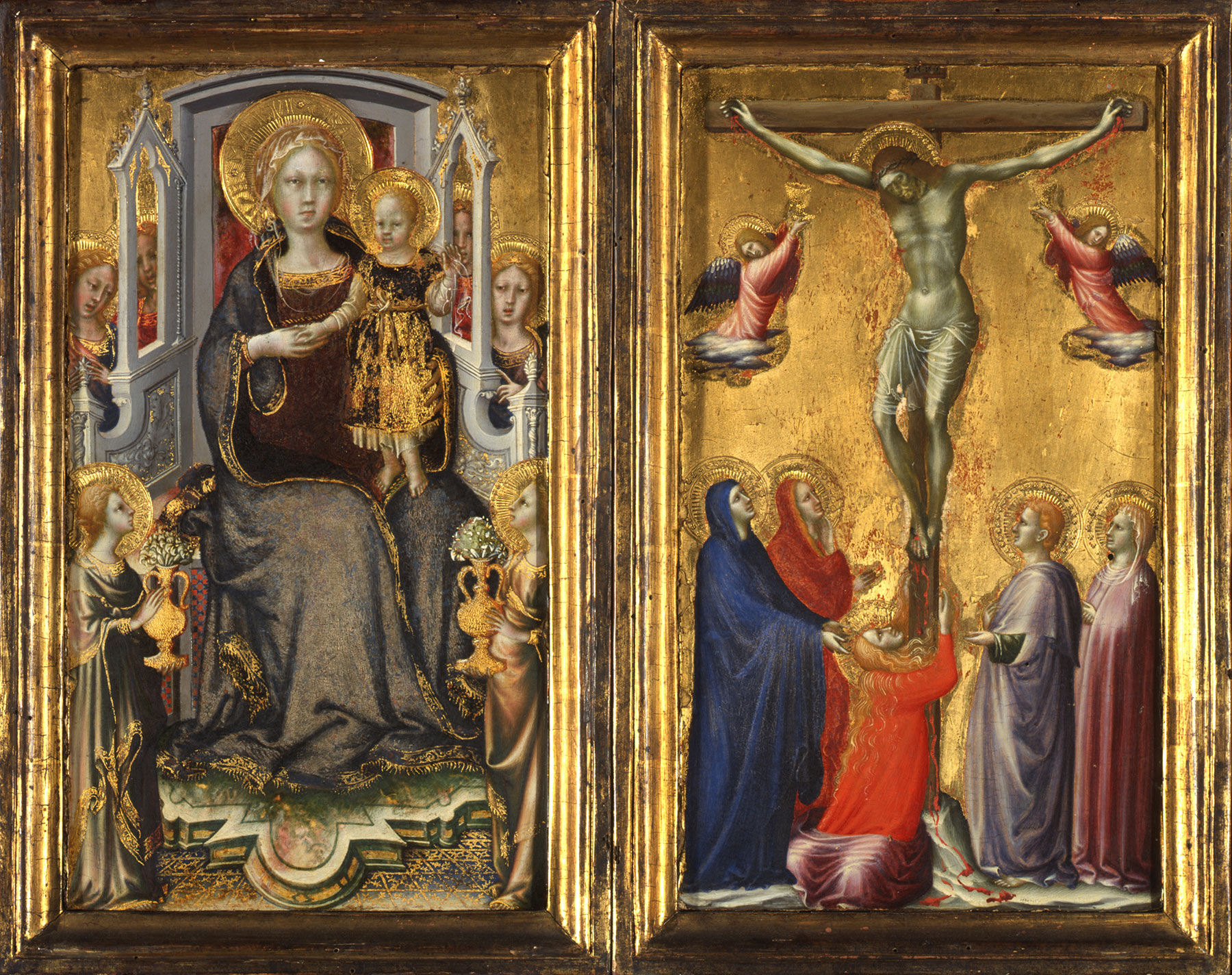 De Marchi, who refers to Arcangelo as a “fiancheggiatore,” or admirer, of Gentile, stops short of implying a direct contact between the two artists, although he notes that their appearance in Florence around the same time, between 1419 and 1420, could not have been coincidental.9 Arcangelo’s use of decorative techniques otherwise found only in paintings by Gentile, however, implies that the two artists must have shared a workshop at some point in their respective carers.10 That Arcangelo was exposed to Gentile’s production much earlier than hitherto supposed is suggested by the Urbino Virgin and Child (see fig. 3), traditionally placed at the head of his Florentine production, around 1420, but more likely executed in the previous decade. The often-noted “Adriatic” components of the framing elements and the internal division of the composition clearly situate the execution of this work outside Florence, in the Marche or the Veneto. The slender proportions of the Virgin and dainty Christ Child present a marked contrast to the robust, rounder bodies in the Yale and Bibbiena panels as well as in the Frick diptych (see fig. 2 and fig. 4); the granulated cloth of honor covering the entire throne—a unicum in Arcangelo’s production—is also inconsistent with the spatial concerns of those paintings. These elements appear more consonant with Gentile’s earliest efforts, strongly influenced by Venetian models, than with Gentile’s Florentine altarpieces.11 Arcangelo’s possible formation in the orbit of Gentile as early as the first decade of the fifteenth century is not out of the question, given that he was most likely already a well-established personality by the time he was entrusted with the prestigious 1416 commission for Città di Castello. Like Gentile, the artist may have had an itinerant career along the Adriatic coast, as well as in Umbria, well before his arrival in Florence.12 Aside from Gentile, the other main influence on Arcangelo’s style seems to be that of the fourteenth-century Riminese school of painting, discernible in both the palette and figure types in the lateral scenes of the Urbino panel—which have little to do with Florentine models—and, even more so, in the Frick Crucifixion, with its distant echoes of the Master of Verucchio.13