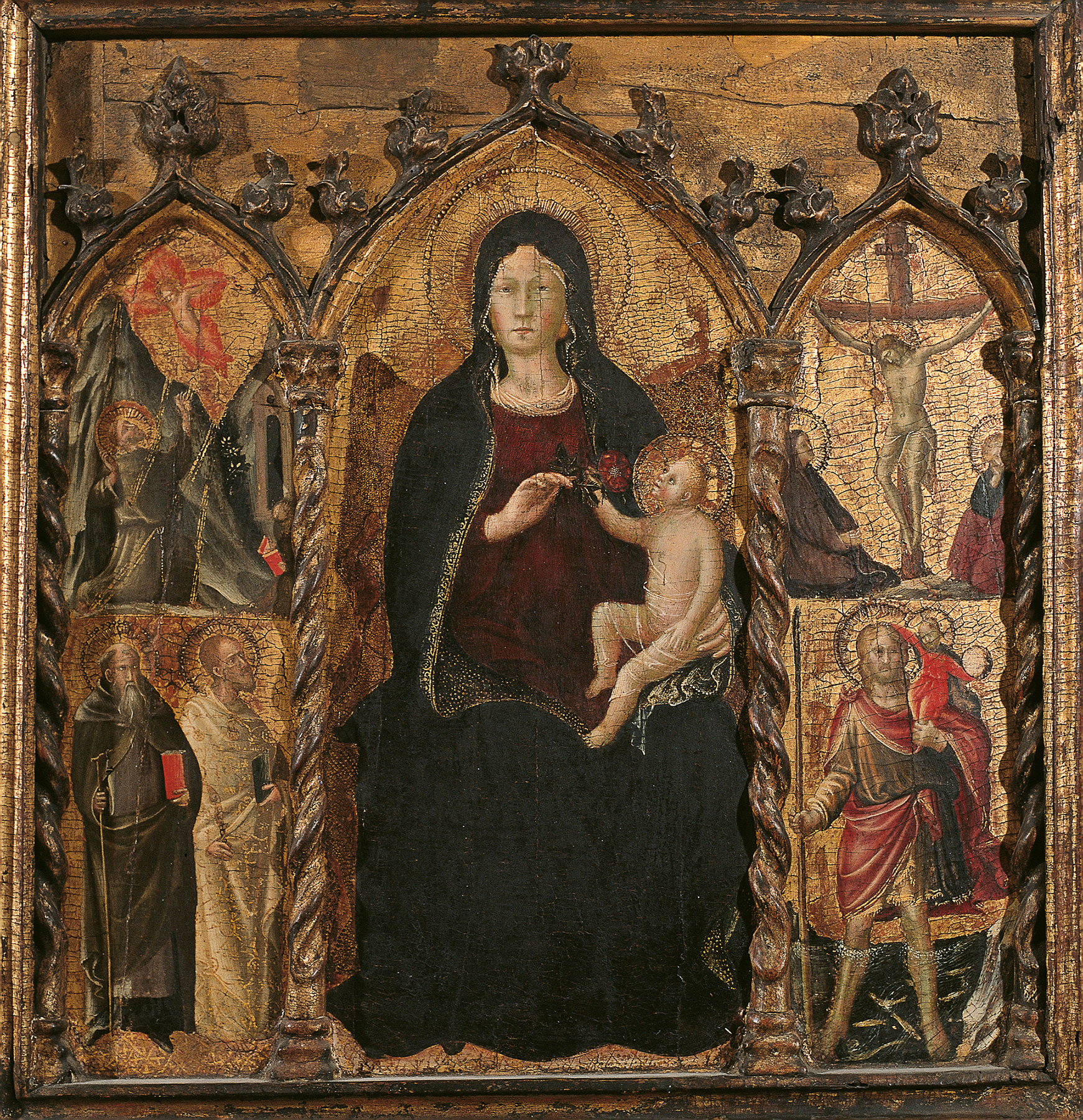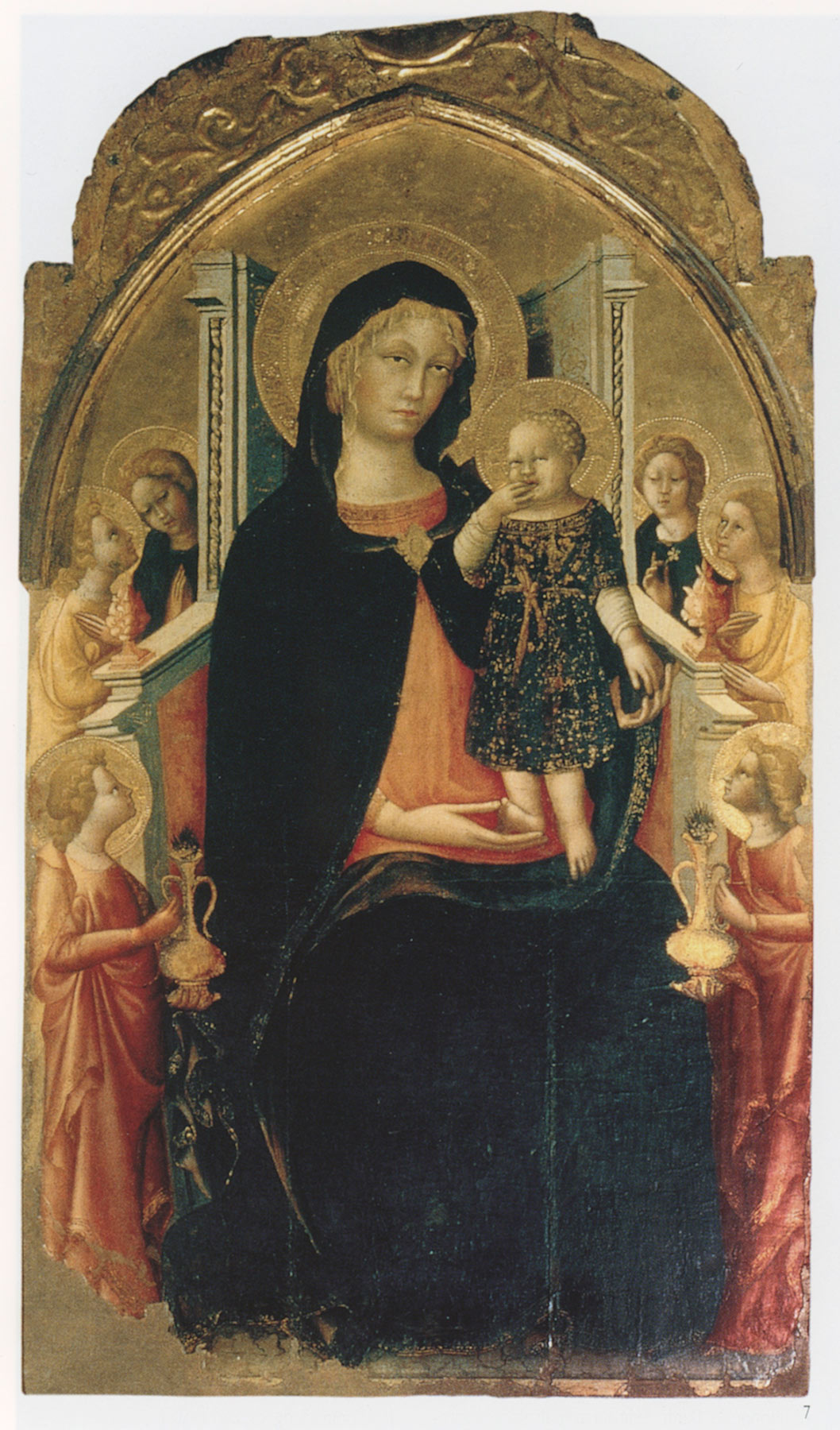 Following an early attribution to Taddeo di Bartolo, suggested by August Meyer, the Yale Virgin and Child was first recognized as a work of Arcangelo by Bernard Berenson and Hans Gronau, and this identification has been unanimously embraced by modern scholarship.3 The work’s current condition, however, has interfered with the proper evaluation of its place within the very limited scope of Arcangelo’s known activity. An accurate assessment of the artist’s full range and personality has been hampered by the paucity of surviving documentary evidence and a corpus of no more than a dozen paintings. Although Arcangelo’s name is first mentioned among the beneficiaries in his father’s will in 1406, the records of his activity are confined to a tightly circumscribed period between 1416 and 1425, when he received commissions in Città di Castello (1416), Florence (1420–24), and Rome (1422), as well as in the Marches (1425).4 The frescoes painted in 1416 in the main Council Hall of the Palazzo Pubblico of Città di Castello, however, are lost, and the last known commission, a large altarpiece signed and dated 1425 in Cessapalombo, near Camerino, was destroyed in a fire in 1889 and is known only through a very poor photograph.5 The absence of these terminal points of reference has made it difficult to chart the evolution of the artist’s style. Arcangelo’s only signed work, a diptych with the Virgin and Child and the Crucifixion in the Frick Pittsburgh (fig. 2), which forms the basis for his identification, already reveals a fully formed personality. Clearly related to this diptych is a small but relatively homogeneous group of images that make up the core of the painter’s unanimously accepted production: the Virgin and Child Enthroned in the Galleria Nazionale delle Marche, Urbino (fig. 3); the present panel at Yale; the Virgin and Child Enthroned with Six Angels in the Propositura of Bibbiena (Arezzo) (fig. 4); and the Virgin and Child with Two Angels in the Pinacoteca e Museo Civici, Camerino. Most modern scholarship has circumscribed the execution of these works, with the exception of the Camerino Virgin, to the artist’s Florentine period or shortly after, scaling their execution between around 1420 and 1425.6 During these years, Andrea De Marchi observed, the painter became a “shadow of Gentile,” sharing in the latter’s success and receiving commissions from some of the most important Florentine banking families, such as the Bardi and Martellini.7 The existence of a “very tight relationship” between the two artists, De Marchi pointed out, is attested to by Arcangelo’s “voracious assimilation of exquisitely Gentilesque decorative techniques,”8 such as those visible in the Yale panel and in all the works gathered around the Frick diptych.