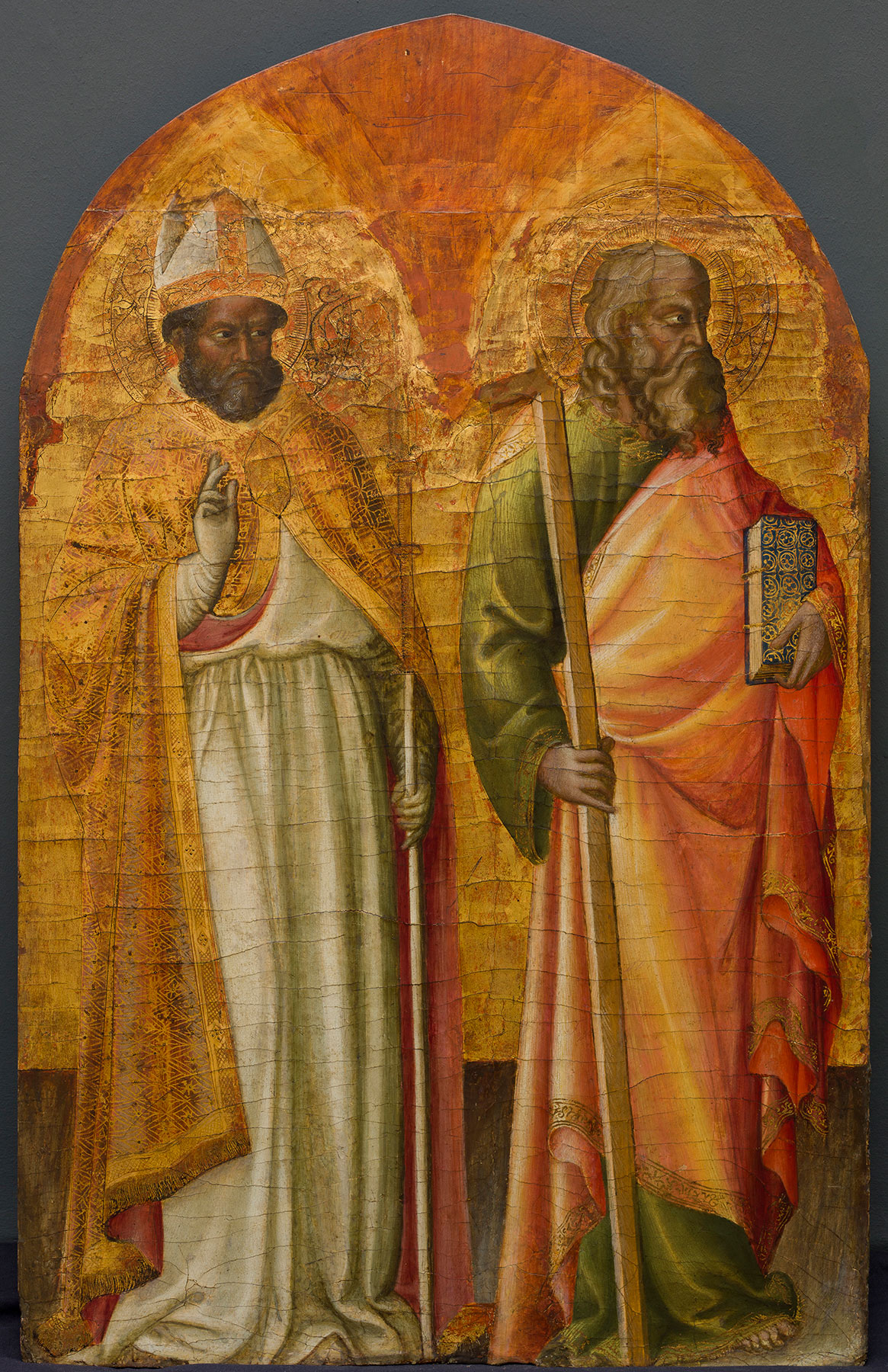 The panel support, of a vertical wood grain, had been irregularly thinned to a depth ranging between 3 and 7 millimeters and cradled, presumably before its acquisition by Maitland Griggs in 1929. The cradle was removed around 1999. No auxiliary bracing structure was introduced at that time, notwithstanding the open seam dividing the two planks of the original support, with the result that the panel now survives as two separate and extremely fragile fragments, one (on the left) measuring 120.5 by 29.2 centimeters, the other (on the right) measuring 120.5 by 40.5 centimeters. Losses along all the edges of both fragments, and along numerous minor splits rising from the bottom or descending from the top of each, were left unretouched, as was a circular loss in the Virgin’s throat, probably caused by a missing plug repairing a knot in the wood. There is a faint indication of a barb along the bottom edge of the paint surface; the top of the round arch has been truncated, and both lateral edges have been shaved to a modest bevel. Surviving remnants of the gold ground in the left fragment are all modern leaf. Gilding at the upper right of the right fragment is original; the gold at the center of that fragment has been reduced to bolus, and gilding formerly at the lower right is now just polished gesso. Decorative gilding along the hems of garments, in the haloes, and on the vases lined up across the foreground is relatively well preserved. Large passages of silver leaf survive only as tarnished bolus, with metal leaf remaining within the engraved hatching that enlivened those areas. Mordant gilt decoration of the dais of the throne is comparatively well preserved. The paint surface throughout is severely abraded, especially in the flesh tones and across the colored marble pavement of the foreground. The forms of the Christ Child are nearly obliterated. The Virgin’s blue robe is less badly damaged than might be expected.