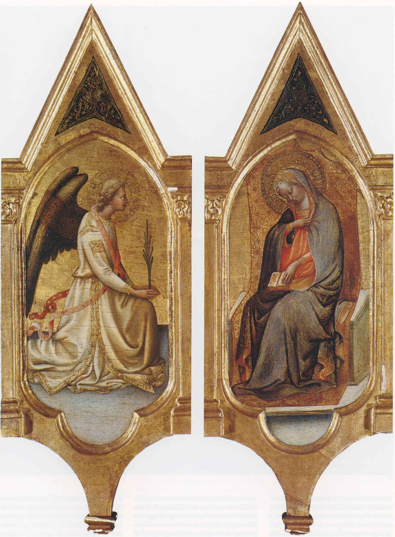 In the most extensive discussion of the Yale panel to date, Alessandro Marchi proposed that it might be the center of a large, undocumented polyptych executed by the artist in Florence between 1423 and 1424, immediately following the execution of the Frick diptych, which he dated around 1420–22.14 Included in the same structure, according to Marchi, would have been a series of panels otherwise assigned to different moments in the artist’s career by previous authors: two pairs of standing saints in the Národní Galerie, Prague (fig. 5),15 first attributed to Arcangelo by Federico Zeri, who associated them with four predella scenes in the Galleria Estense, Modena;16 and two pinnacles with the Annunciation in a private collection in Dallas (fig. 6), also published as works of Arcangelo by Zeri but with an earlier chronology than the Prague/Modena panels.17 Marchi’s reconstruction was not questioned by Andrea De Marchi and Claudia Caldari,18 whereas Olga Pujmanová accepted the relationship of the Prague Saints to the Modena predella but thought that the inclusion of the Yale Virgin and Child in the same complex did not “seem probable.”19 The possibility of a common provenance had already been dismissed by Zeri, who pointedly observed that the Prague and Modena panels had “little or nothing” in common with those works that could certainly be inserted in Arcangelo’s Florentine period—including the Yale picture—and belonged instead to a later phase following the artist’s return to the Marches.20 The stern expressions and powerfully built figures of the Prague Saints Zenobius and Andrew (see fig. 5), who bear no relationship to Gentile’s art, are, in fact, incompatible with the dreamy atmosphere and delicate handling of the Yale Virgin. Also unlike the Yale Virgin is the unusual and rather coarse freehand tooling in the saints’ haloes, not traceable in any other known work by the artist. Finally, the incised line and remains of the original paint on the bottom right of the Yale panel appear to indicate that the multicolored surface continued across into the laterals of the original polyptych; unless the gray floor on which the Prague saints are presently standing is the result of later repaints, such a discrepancy reinforces the stylistic argument against their inclusion in the same structure.