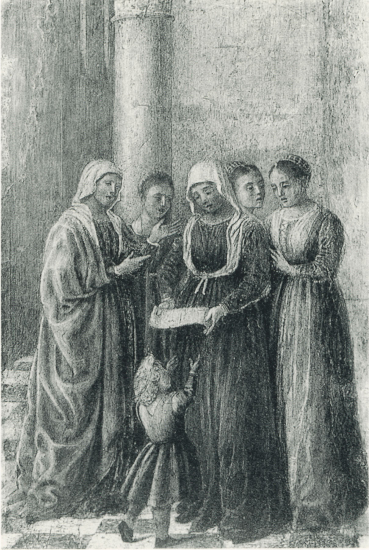 The innately different approaches of the two brothers are highlighted by the comparisons between the Washington panel and the San Francisco Vision of Fra Paolino (see fig. 5), which repeats the motif of the seated listeners viewed from behind. Beyond the more elongated figural proportions and uniform expressions, the San Francisco panel is distinguished, above all, by a careful, meticulously controlled draftsmanship that cannot but be viewed as an indicator of an altogether different artistic sensibility—one more suited to the precise representation of architectural settings than the vivid expression of emotional content. The spatial clarity of the San Francisco fragment—and of all the other panels from the same altarpiece, including the Yale Infancy—moreover, is entirely at odds with the compressed setting of the Washington episode (see fig. 6). As pointed out by Christiansen, these works reveal a personality that is fully conversant with a new style of narrative painting, based on Albertian precepts, in which architecture is put in the service of storytelling to represent a given subject “in the clearest possible terms.”50 The preponderance of circumstantial evidence suggests, as it has to many other scholars, that this more rational approach, which reached its zenith in the elaborately conceived interiors of the Vincent Ferrer altarpiece, reflects the hand of Bartolomeo, presumed to be the younger and more modern of the two brothers, but the surviving documentary evidence does not allow for any certitude. As a result, the attribution to “Agnolo and Bartolomeo degli Erri” should be considered a label of convenience that, while reflecting the collaborative nature of the enterprise, simultaneously acknowledges the different levels of participation in the execution. The distinctions of hands, it must be noted, are not always confined to different scenes in the Thomas Aquinas series, and it is not inconceivable that some of them may have been painted by more than one artist. Issues of condition aside, while all the other compositions reflect an internal stylistic coherence, the Yale picture, like the ex-Schweitzer childhood scene (see fig. 10), appears to combine the spatial solutions of one artist with the fuller forms and looser handling—especially noticeable in the irregularity of the drapery folds—of the other.