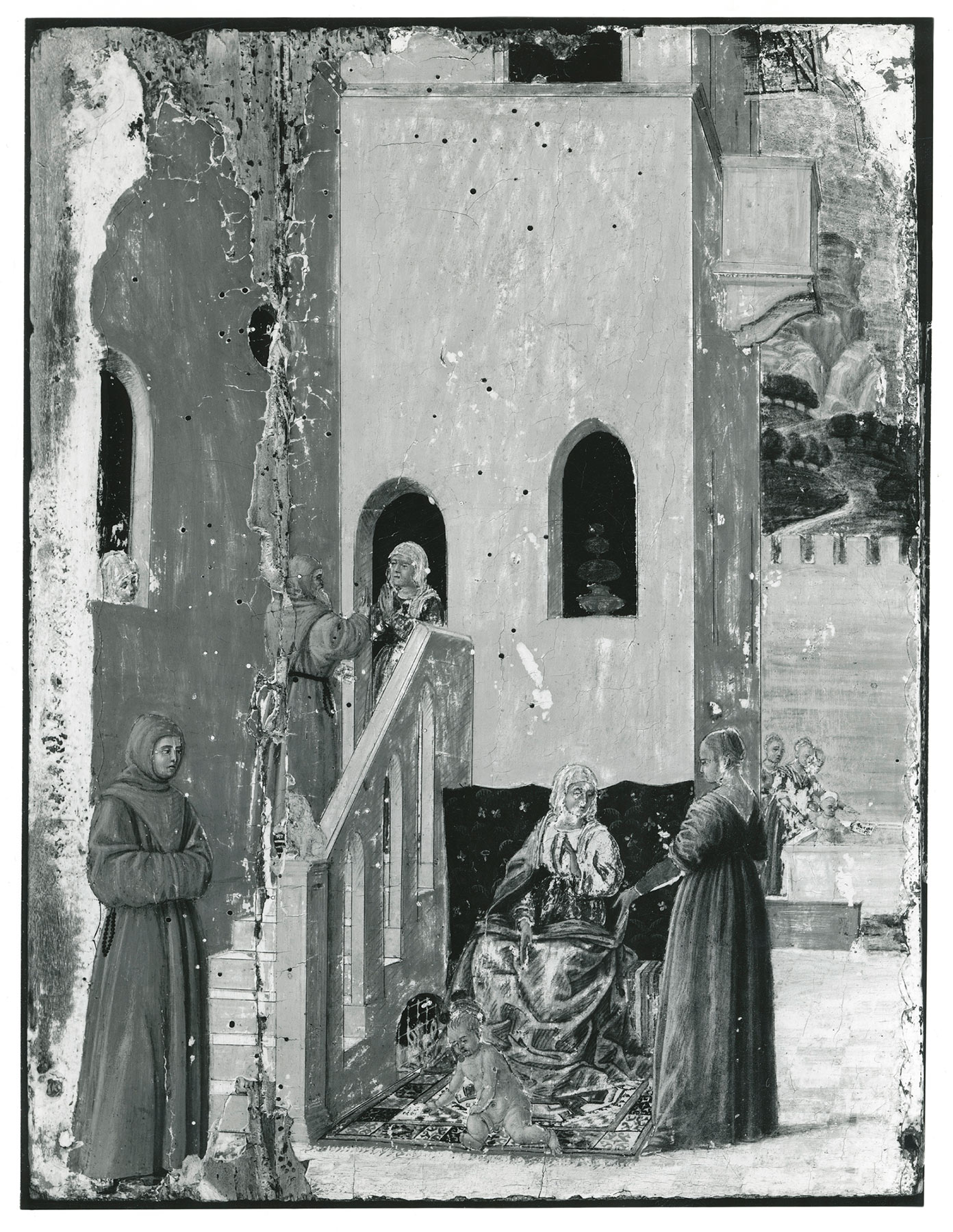 The panel support, of a vertical wood grain, has been thinned to 1 centimeter, cradled, and waxed. A split, 8 centimeters from the left edge, running the full height of the panel has resulted in major losses of paint along its length; another, 17 centimeters from the left edge, has scarcely interrupted the paint surface. Two smaller splits at the bottom edge, 12 and 19 centimeters from the left, seem to have been provoked by the cradle. Except for the total losses along the leftmost split, the paint surface is reasonably well preserved, with light abrasion largely confined to the face of the building in the center, the figure of Saint Thomas’s mother in the center foreground, and the attendants bathing Saint Thomas in the middle ground at right. A radical cleaning by Andrew Petryn in 1961 exposed these losses and excavated the ground and linen layers along the split. It also left irregular losses to the gesso borders exposed along both sides of the composition (fig. 1). These and the visible exit holes from worm damage were filled and repainted by Elizabeth Mention in 2000, who liberally reinforced the abraded passages as well, especially in the green dress of Saint Thomas’s mother.