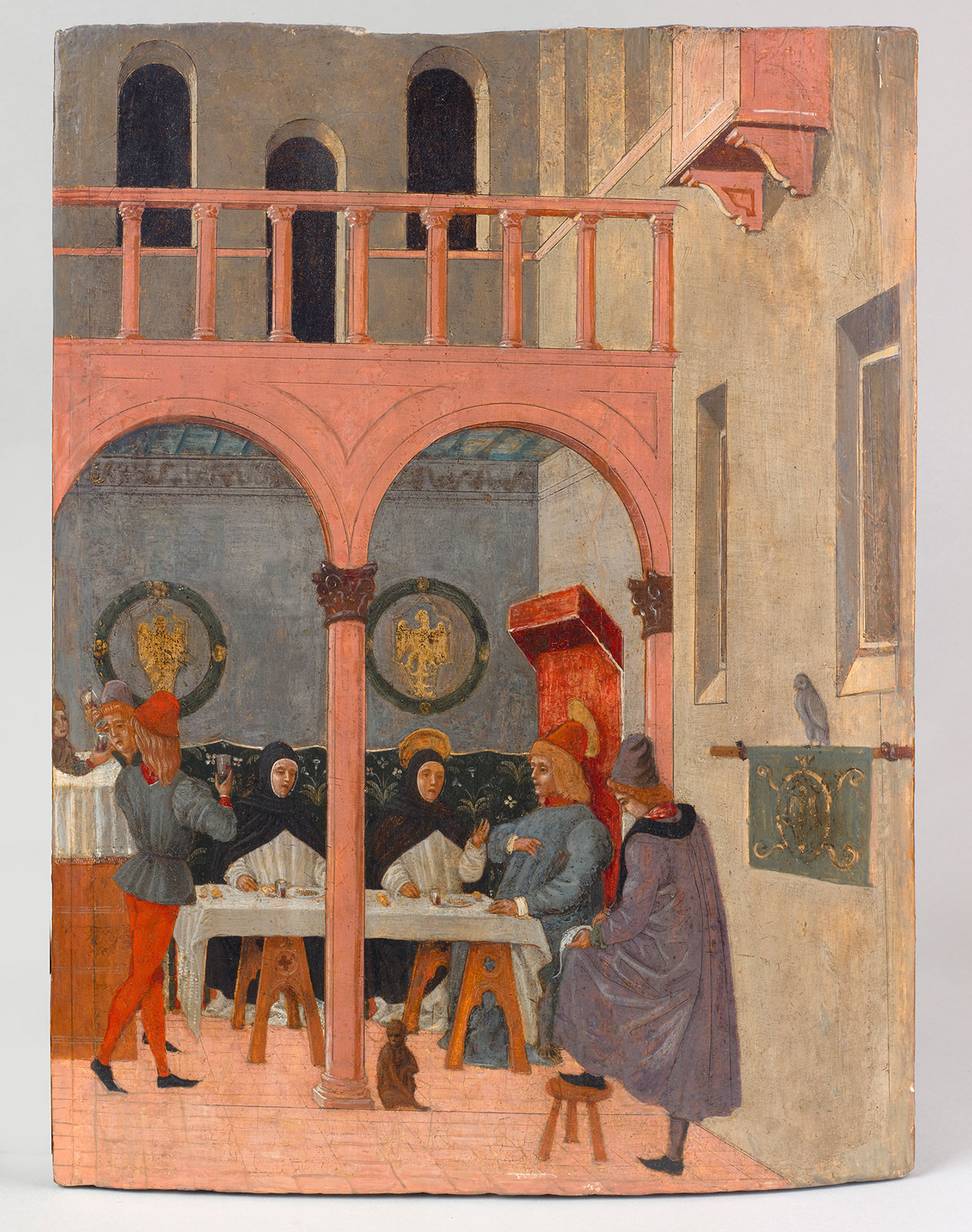 Like the Yale Infancy and Metropolitan Museum Saint Thomas Aquinas Aided in the Interpretation of Scripture, three of the paintings made known by Berenson are clearly derived from events described in William of Tocco’s biography. The first panel, on the art market in 2013 and formerly in the Paravicini collection, Savoy, France (see fig. 3),15 illustrates an event in chapter 43 of the Ystoria, recounting how Saint Thomas and his prior in Paris were invited to dine at the table of the canonized king Saint Louis of France, who was so impressed by Thomas’s ability to remove his mind from the frivolity of the banquet to contemplate theological questions that he ordered his secretary to write down the theologian’s thoughts for posterity. The painting shows Saint Louis seated at the head of a table placed in the open loggia of a palace. To the king’s right is Saint Thomas, flanked by his prior. Thomas is shown with raised hand, in the act of expostulating, as the king’s scribe, his back to the viewer and knee raised for support on a stool, takes notes on a piece of parchment. Against a wall in the background are two coats of arms, one of which, as noted by Berenson, is clearly recognizable as the Este eagle.