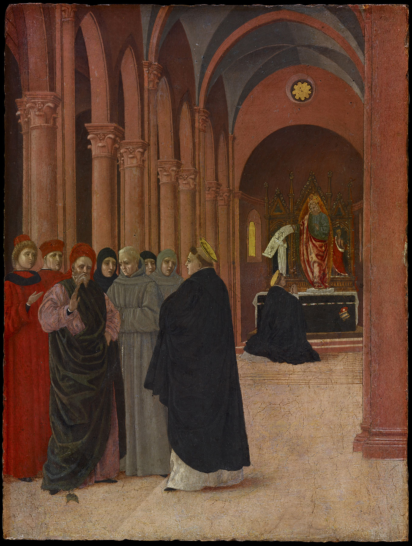 In a manner that closely adheres to the last passage, the San Francisco panel shows the full-length figure of Christ with his feet firmly planted on the volume placed by the saint on the altar table. In his right hand is a scroll inscribed “[BE]NE [SCRI]PSISTII.” In the foreground are the university masters who petitioned Thomas, as well as two Franciscan and two Dominican friars, as if to emphasize the consensus over his eucharistic philosophy.