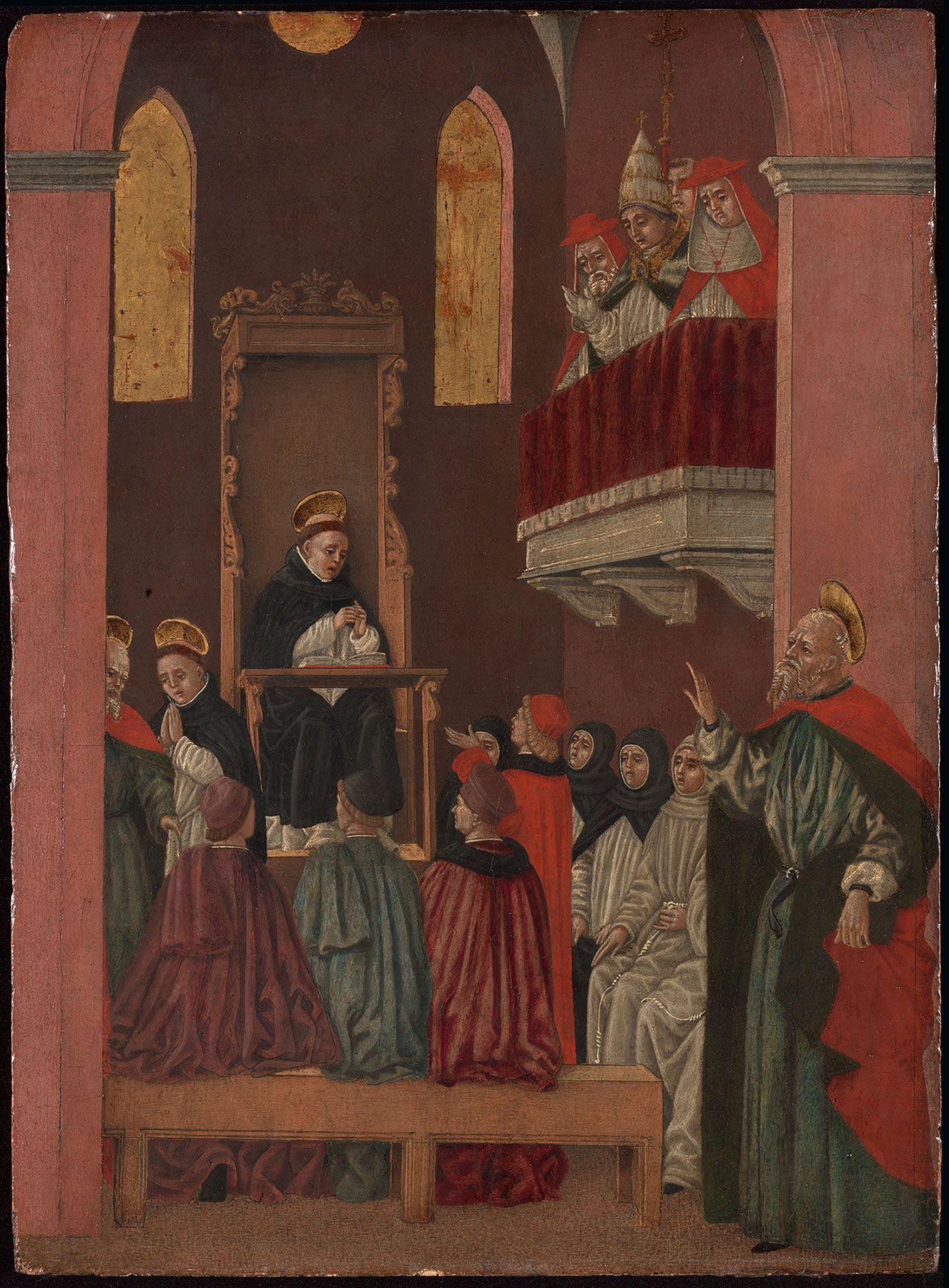 The fourth panel published by Berenson, in Washington (see fig. 6), was briefly described in a footnote by the author, who saw it when it was still in the Lazzaroni collection in Rome, as “Saint Thomas Preaching.”17 The subject of this image has been questioned by some critics, however, who have observed that the Dominican speaking before a crowd in front of a Dominican church—clearly identified by the presence of Saint Dominic in the sculptural group above the portal and again in the medallion above—does not have a halo, as in all the other episodes in the series, and is therefore probably not a saint.18 The panel, truncated at the top, originally showed the figure of God the Father surrounded by cherubim holding open a large volume. It has been suggested that the book could refer to the writings of Saint Thomas Aquinas, rather than a volume of Scripture, held up by God as a model for the aspiring preacher.19 Above an arched entrance to the palace on the right of the composition is the Este eagle, already seen in the ex-Paravicini panel (see fig. 3).