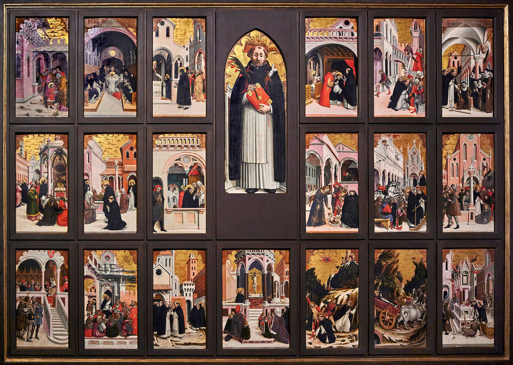 A third personality, belonging in all probability to an older generation than Agnolo and Bartolomeo and christened the “Master of the Saint Peter Martyr Dossal” by Maria Cristina Chiusa,51 was responsible for the earliest of the altarpieces on the rood screen of San Domenico (see fig. 9). Newly discovered documentary evidence suggests a secure terminus post quem of 1449 for that commission, executed for the Modenese merchant and banker Antonio Colombi in fulfillment of his mother’s testamentary bequest.52 The brilliantly colored, engaging stories of Peter Martyr reflect an already fully developed idiom rather than the efforts of a developing artist. The elaborate Gothic structures, inconsistent proportions, and illogical spatial structure, along with the dark, caricatural modeling of the facial features, denote a provincial artist, possibly formed on the example of manuscript illuminators and strongly influenced by Paduan and Ferrarese models. Presumably executed in consultation with the Dominican monks, who most likely determined its subject matter, the Saint Peter Martyr dossal must have dictated the format of the later Saint Thomas Aquinas altarpiece, which shows evidence of similar Gothic framing elements. In the absence of comparable cycles dedicated to the life of Saint Thomas Aquinas, it is impossible to estimate the number of panels that completed the series. If the ex-Schweitzer fragment was indeed part of the same complex, bringing the total number of surviving narrative episodes to eight, it must be assumed that at least one other story is missing, since the original arrangement would have involved four scenes arranged vertically on each side of the saint, with the Death of Saint Thomas Aquinas (see fig. 8) in the predella. But it cannot be excluded that the dossal included as many episodes from the life of the saint as that of Saint Peter Martyr, with thirteen scenes, or that of Saint Vincent Ferrer, with nineteen.