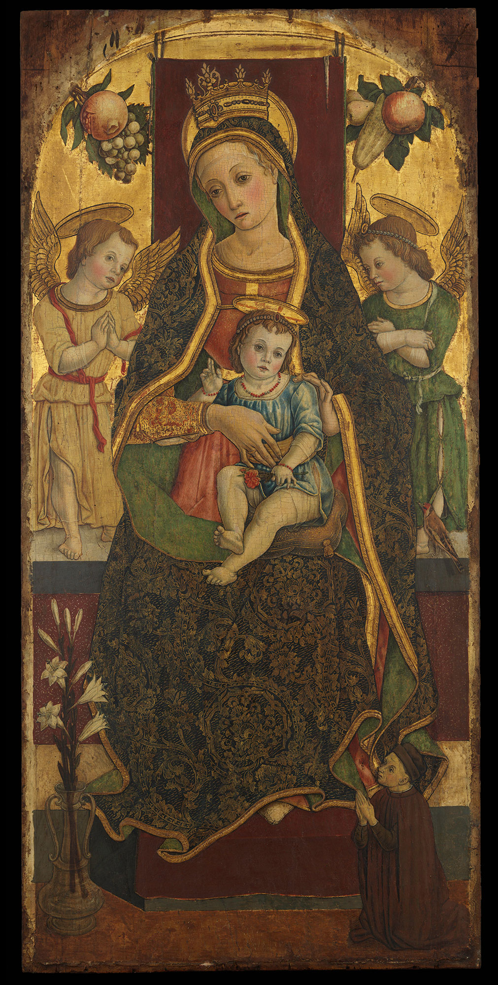No other surviving lateral fragments of altarpieces by Vittore Crivelli can be associated with the Yale panel on the basis of style as well as dimensions and framing elements. Di Provvido’s identification of the Queens Virgin and Child (see fig. 2) as the central compartment of the same structure is plausible based on its dimensions, but the vicissitudes suffered by that panel make any proper judgment difficult; the classicizing throne of the Virgin, moreover, seems to point to a later moment in the artist’s career, closer to around 1490. Based on its provenance and early date, another possible candidate is the Virgin and Child Enthroned with Two Angels and a Donor in the Metropolitan Museum of Art, New York (fig. 3), which is recorded in the collection of Pietro Vallati in 1858 and may have been acquired at the same time as the Yale Saint Peter.9 While this provenance alone does not guarantee that the two works belonged to the same structure, the Metropolitan Virgin and Child, at one time believed to be a work of Carlo Crivelli, shares the same delicate handling and subtleties of execution as the Yale picture. Dated by Zeri and Di Provvido between 1480 and 1485,10 the Metropolitan painting is virtually contemporary to the Saint Peter but is larger in scale than would be expected, considering the relative sizes of the panels in Vittore’s other altarpieces. Issues of reconstruction aside, Di Provvido’s suggestion that the Yale fragment might belong to the triptych painted by the artist for the altar of Saint Peter in the church of Santa Maria della Carità in Fermo remains valid.