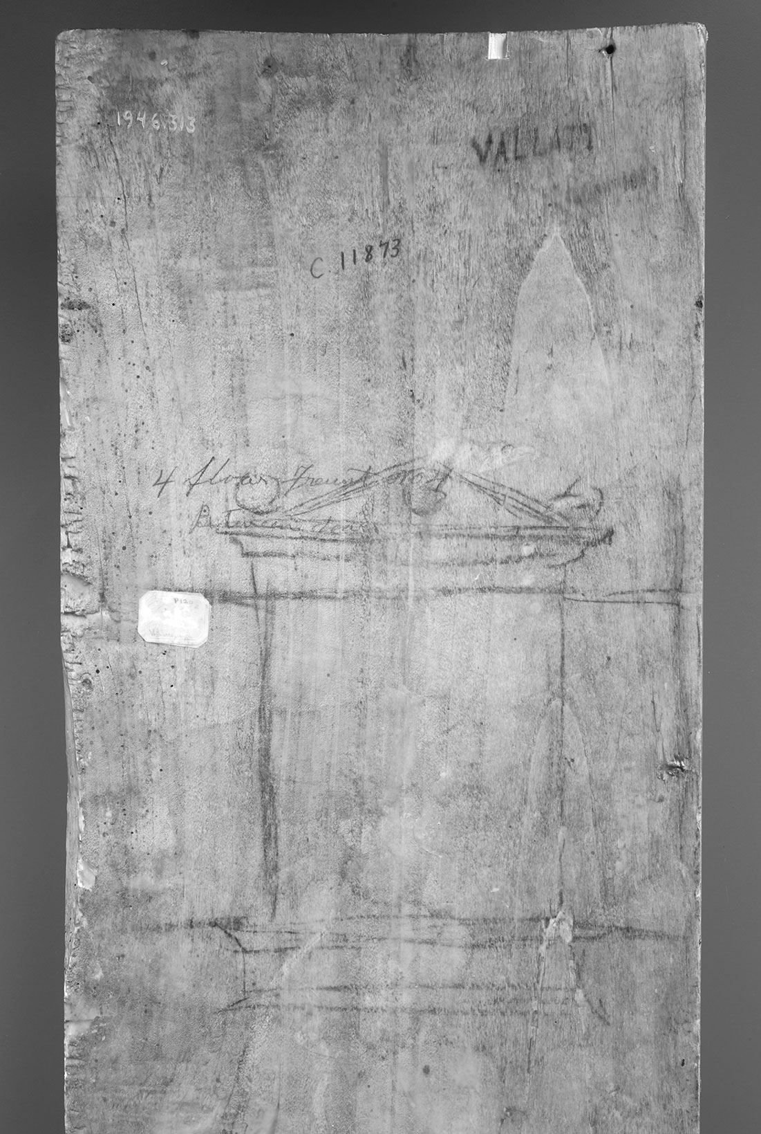 An architectural sketch on the back of the Yale panel showing a triangular pediment with two balls resting on the ends of the entablature (fig. 4), seemingly anticipating the classicizing Renaissance forms of some of Vittore’s later triptychs,11 raises the issue of the artist’s role in the design of his frames. It also calls to mind a 1472 document recording Vittore’s activity as an architect during his residence in Zadar, Croatia, when he was asked by the erudite archbishop and humanist Maffeo Vallaresso to provide drawings for the new facade of the collegiate church of Saint Mary Major.12 —PP