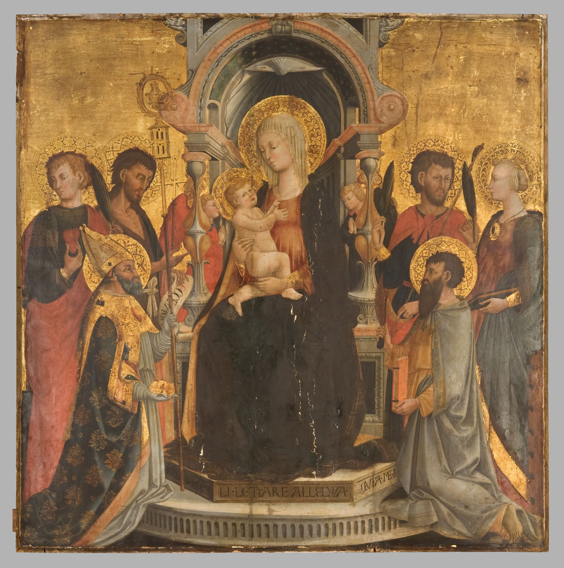The lack of specificity in the Ricordanze in naming the saints accompanying the Virgin and Child in the Poggibonsi altarpiece has so far frustrated attempts to identify it. One surviving altarpiece, however, is a prime candidate for this “missing” work: a Virgin and Child Enthroned in the Philadelphia Museum of Art (fig. 3). Carl Strehlke has correctly dated this work to ca. 1457 on stylistic grounds and associated it with an entry in the Ricordanze commissioning an altarpiece for the church of Santa Maria alla Canonica in Putignano near Greve, in Chianti.11 That altarpiece, however, was specified as being 4 braccia wide and only 4 2/3 braccia tall, including its frame with cornice and predella; its painted surface would therefore have been wider than it is tall. The Philadelphia panel (165.1 × 163.5 cm) is almost exactly 3 braccia square, the size indicated for the Poggibonsi altarpiece. Among the six saints in the Philadelphia panel, Saint Nicholas occupies the position of honor, kneeling in the foreground on the Virgin’s right. The Virgin turns her regard toward him and seemingly offers him the gift of her Son. If the altarpiece predella was completed by images of confraternity members at either side, as specified in the account book entry, and these were more or less the same size as the Saint Nicholas scenes then, the five compartments would account for a total width of about 155 centimeters—more, if any amount of wood separating the scenes was lost when they were cut apart. While the evidence is not absolutely conclusive, it is probable that the Philadelphia altarpiece along with the Yale Charity of Saint Nicholas and its companion scenes were originally part of the commission from the Confraternity of San Niccolò in Poggibonsi in 1456–57. —LK