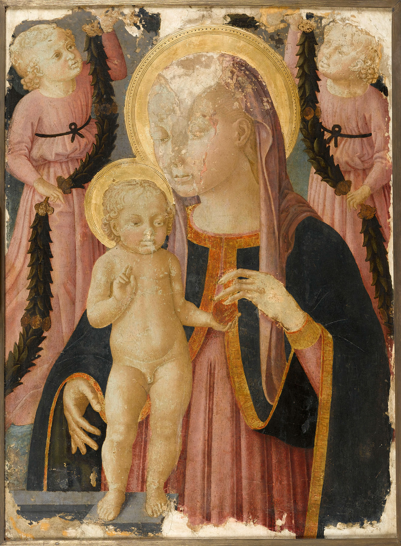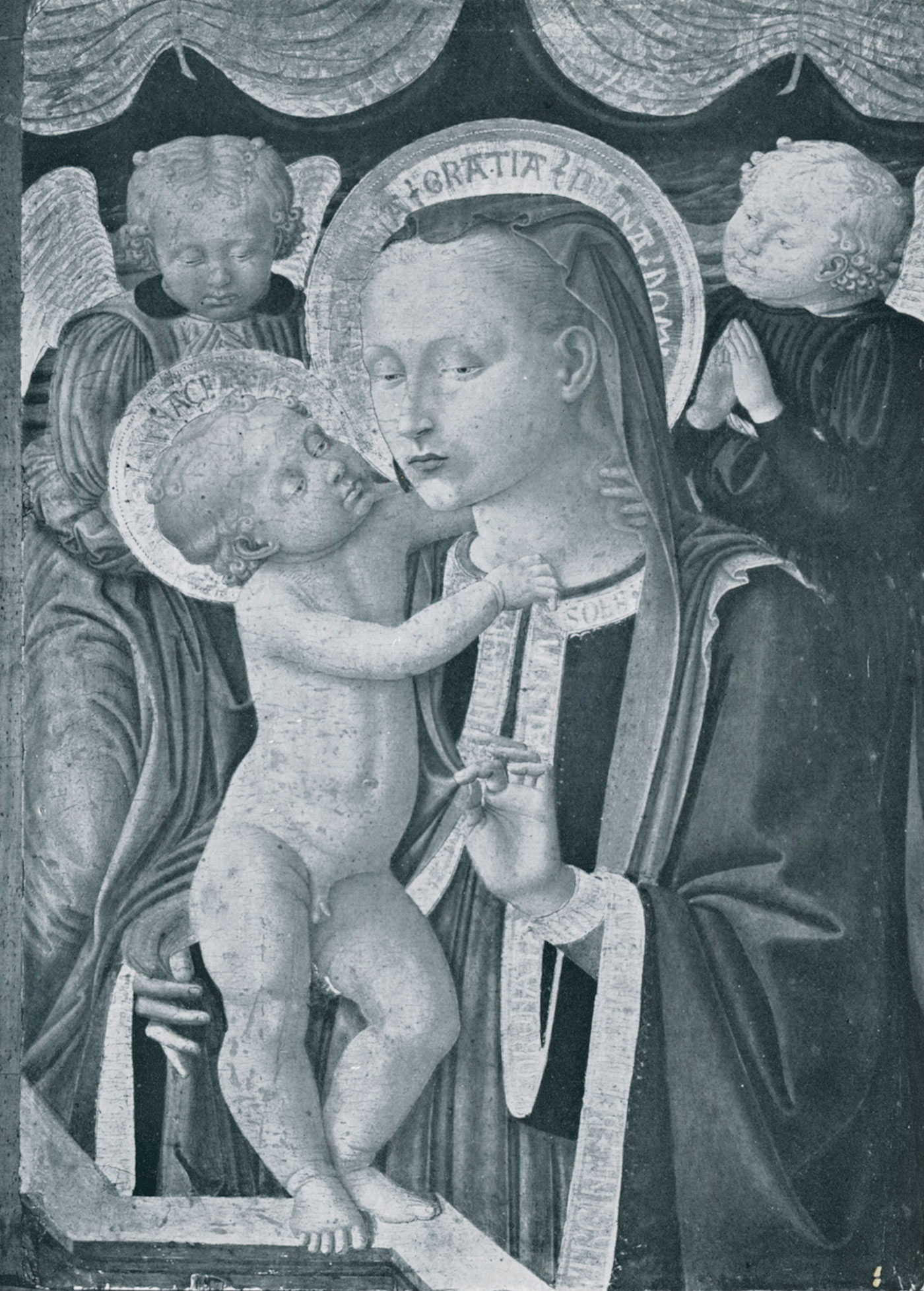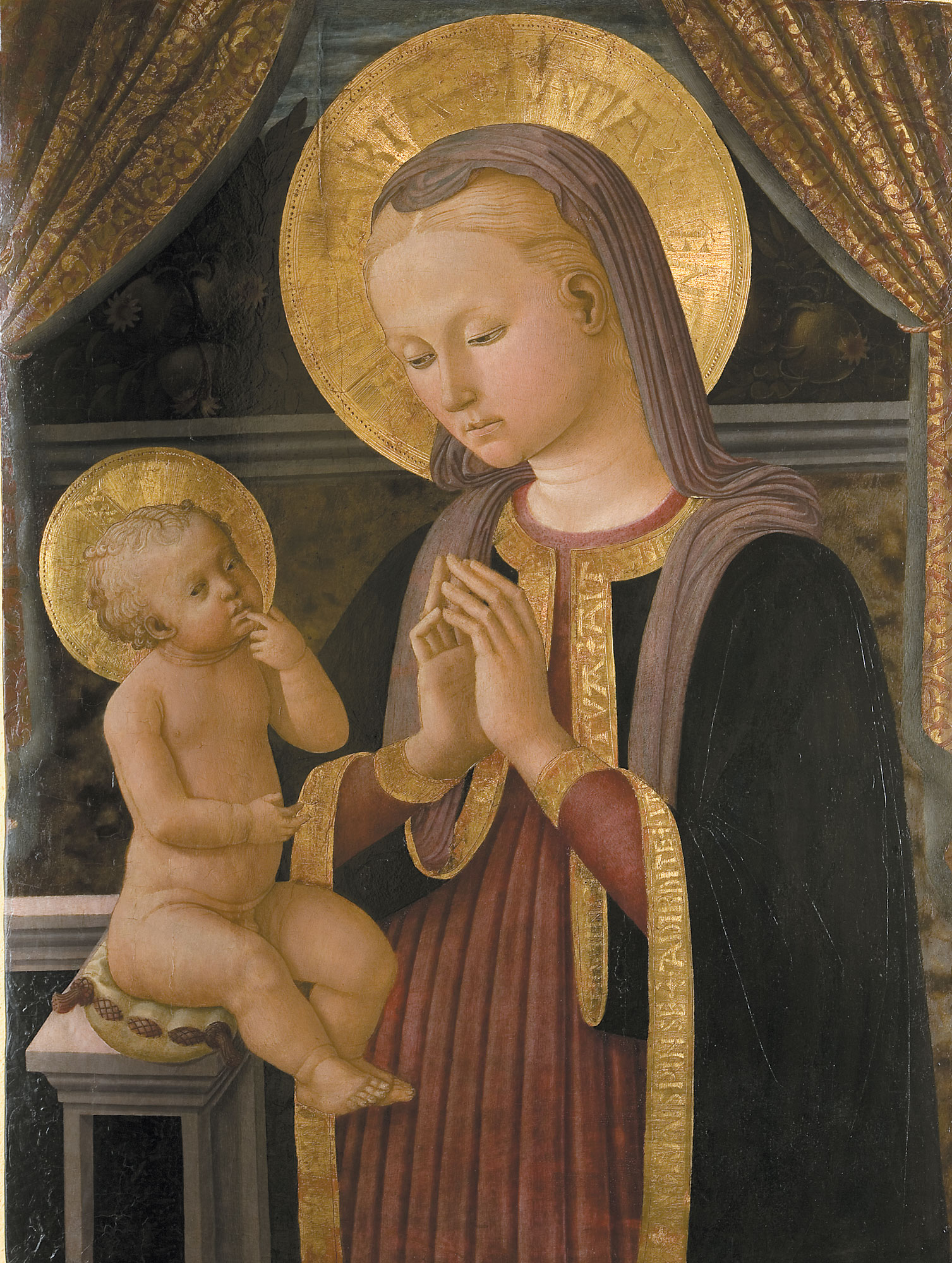 The Virgin, shown half length and turned three-quarters toward the viewer, supports her Child standing on a short stone ledge before her at the left. The Child is naked. He draws close to His mother with His left arm wrapped around her neck. His right hand rests at the collar of her dress, and the Virgin gently stretches her left hand forward with a pinch of her veil to cover Him. Behind the Virgin and Child are two small angels adoring the figures in front of them. The angel on the left wears a pink dress slit to the thigh and has green wings. The angel on the right wears a green-glazed dress and has pink wings. Behind them is a hedge of vegetation (now difficult to read due to damage of the green pigments) and a blue sky, all seemingly revealed by a gold damask curtain painted as though parted in the center of the composition and tied back at the upper corners. The haloes are rendered as burnished disks of gold with rims of punched ornament and tightly engraved radial incisions. The Child’s (cruciform) halo is inscribed IHESVS CHRISTVS, outlined by radial incisions, while the Virgin’s bears the inscription AVE MARIA GRATIA PLENA DOMINUS, similarly outlined. The gilded hem of the Virgin’s blue robe is also lettered, with excerpts from hymns of praise. Over her left arm is a quotation from Canto 33 of Dante’s Paradiso (lines 13–14), the incipit of Saint Bernard’s rapturous vision: DONNA, SE’ TANTO GRAN[de e tanto vale] CHE QUAL VUO[l grazia] E A TE NORRICORRE. Over her right arm is a fragment of Petrarch’s Canzone 366, the concluding song of the Canzoniere: [Vergine] BELLA CHE [di sol vestita . . . piac]ESTI SI CHE [’n te sua luce ascose].
