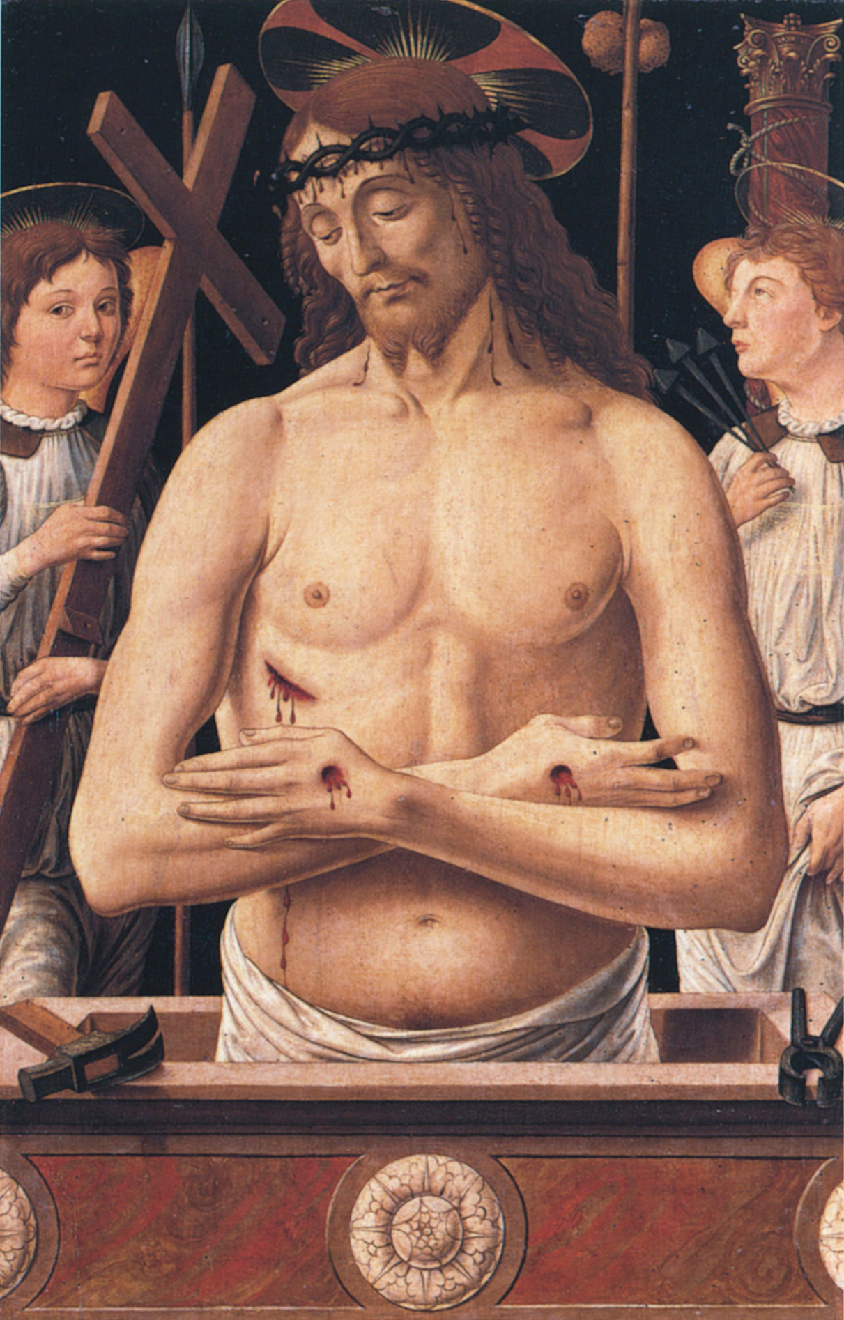 That the Yale Crucifixion, by contrast, should be assigned to Biagio d’Antonio is evident from a consideration of the figure of Saint John the Evangelist, whose distinctive profile is recognizable in dozens of paintings by Biagio in which he depended upon the drawings by Verrocchio with which he is believed to have executed the altarpiece from San Domenico del Maglio, now in Budapest (fig. 2), on behalf of the older master.13 The simplicity of the composition, airiness of the landscape, and facial types of the Virgin and Christ (to the extent that the latter can still be read in the painting) do not point to a dating as precocious as the Budapest altarpiece, however, which may have been painted in the early 1470s. They instead beg comparison to an altarpiece by Biagio d’Antonio showing the Virgin and Child Enthroned with Saints John the Baptist and Jerome in the Propositura dei Santi Jacopo e Stefano at Gambassi (fig. 3) or to a Man of Sorrows (fig. 4) in the Pinacoteca Comunale at Faenza.14 The latter was dated by Bartoli after 1492, the year in which the Banca del Monte di Faenza, its donor to the Pinacoteca, was founded, although no document indicating when the painting might have become property of the bank has been uncovered. Antonio Corbara preferred a date for the painting close to 1487 on stylistic grounds, and this seems more easily defensible.15 Similarly, Bartoli dated the Gambassi altarpiece to the second half of the 1490s, but this date should be advanced to the second half of the preceding decade by comparison not only with Biagio’s contribution to the Albizzi Tornabuoni spalliera cycle of 1487—the Betrothal of Jason and Medea in the Musée des Arts Décoratifs, Paris16—but also with contemporary altarpieces by Piero di Cosimo, Cosimo Rosselli, Filippino Lippi, and others that employ the same architectural screen with three tall arched openings as a backdrop and projecting hexagonal base as a dais to the Virgin’s throne.17 The poses of the two saints in the Gambassi altarpiece and, to a degree, of the Virgin and Saint John in the Yale Crucifixion are inspired by the lateral figures in Verrocchio’s Pistoia altarpiece, commissioned probably in 1475 and composed between that date and 1478 but completed and delivered by Lorenzo di Credi only after November 1485.18 While it might be assumed that Biagio d’Antonio had access to the unfinished altarpiece in Verrocchio’s studio, there is little reason to believe that it would have exercised a strong influence over him until it was revealed in its fully completed form and installed in the chapel of the Sacrament at Pistoia Cathedral, probably in 1486 or 1487. —LK