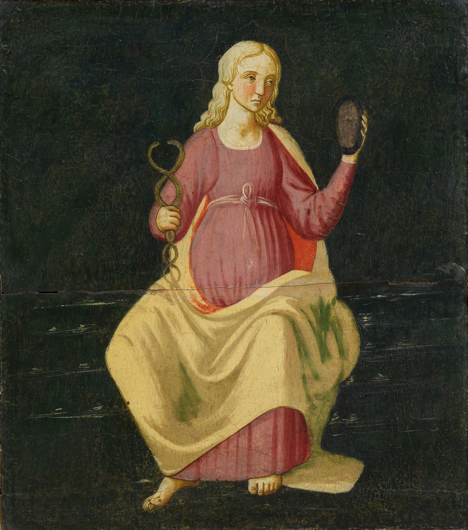 Although exact parallels for the caricatural figure style in this panel are difficult to find, the general type of the landscape recurs in numerous paintings by Biagio, generally with a more refined execution. The hardened facial features, slightly oversize heads, and curiously small hands of all the figures do bear comparison to several works thought to be Biagio’s earliest (known) efforts: a frescoed niche showing Saint Michael the Archangel between Saints John the Baptist and Paul, as well as Saint Sebastian, Saint Christopher, and an Annunciation, formerly in the Oratorio di San Michele at the Castello di Baroncoli, near Calenzano;10 an Adoration in the Radcliffe Collection at the Chateau de Cheseaux, Cheseaux-sur-Lausanne, Switzerland;11 an Adoration in the National Gallery of Ireland, Dublin;12 a Virgin and Child Enthroned with Saints John the Baptist and Peter and Two Music-Making Angels in the Museum voor Schone Kunsten, Ghent, Belgium (fig. 1); and, to a lesser degree, the Virtues painted on the end panels of the Morelli-Nerli cassoni in the Courtauld Gallery, London (fig. 2). The latter is a documented work for which Biagio and his then partner, Jacopo del Sellaio, received three payments in November and one in December of 1472.13 Two years earlier, in 1470, Biagio is mentioned in the Memorie notate of Benedetto Dei as apparently sharing a workshop with Cosimo Rosselli.14 The latter’s Saint Barbara altarpiece of 1468–70 relates suggestively to the Yale panel in its figural eccentricities but less closely than do the works by Biagio thought to be roughly contemporary to it.15