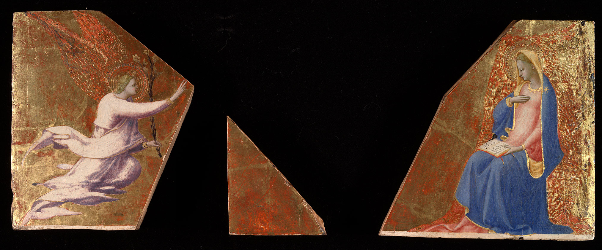 The three fragments (fig. 1), cut from two panels with a vertical wood grain, all retain their original thickness of 1.7 centimeters and remnants of painted porphyry decoration with a white border on their reverses, better preserved in fragment c, the Virgin Annunciate, than in the other two. Fragment a, the Annunciatory Angel, and fragment b, a wedge of gilding, were cut from a single panel and were reconstructed with a plywood inlay in 2000 to an approximation of their original demilunette shape by Mark Aronson; their combined dimensions are now 18.3 by 22.4 centimeters. The back (left) edge of the Angel is slightly beveled away from the picture surface and is likely to be original. The back (right) edge of the Virgin has been trimmed, but a lightly engraved line running the full height of the panel 3 millimeters from its right edge suggests that little or no surface of the image has been lost. Gilding on this panel has been lightly abraded, and oil glazes originally modeling the tooled cloth of honor covering the back of the Virgin’s throne are lost. The paint surface is beautifully preserved. Gilding on the panel with the Angel and on the wedge has been lightly abraded. The paint surface of the Angel is well preserved, but oil glazes covering his wings have been lost, and the purple shadows of his draperies have faded.