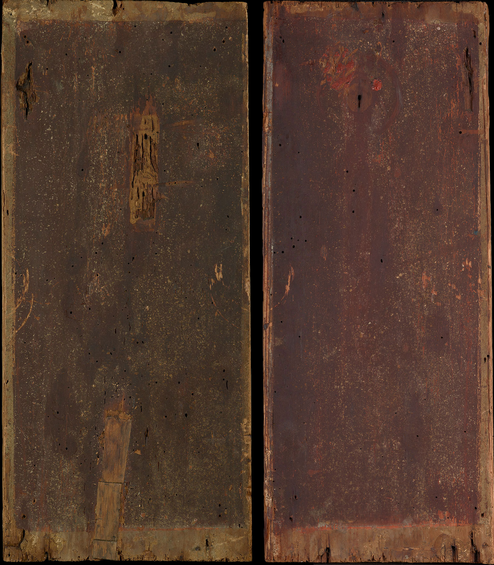 The relationship of the three fragments to each other and their approximate original dimensions are indicated by the painted decoration of their reverses: a fictive porphyry field with painted white border (fig. 3). The Virgin, which was trimmed at the right and left, currently measures 17.7 centimeters in width but was once at least 20 centimeters wide. The Annunciatory Angel has been more aggressively cropped, but its reconstruction with the triangular section of unpainted gilding—the painted arches on the reverses of the two fragments are continuous—results in a panel 22.4 centimeters wide. These dimensions correspond to those of a pair of tabernacle wings now in the collection of the J. Paul Getty Museum, Los Angeles, portraying Saints Francis and a bishop saint in the left wing (52.7 × 23.2 cm) and Saints John the Baptist and Dominic in the right wing (53.7 × 21 cm) (fig. 4). The Getty panels have painted reverses (fig. 5) identical to those of the Yale panels, and the painted white margins of the Getty panels trimmed across their upper edges continue along the lower edges of the Yale panels. X-radiographs of the four panels show that the vertical wood grain of their supports is continuous across the two pairs. Judging from the varying widths of the white painted margins in the Getty panels, they, too, have been trimmed somewhat in width, especially along their inner edges, resulting in a total width for the two wings of approximately 46 centimeters, or slightly more, when folded closed. Their total original height is more difficult to estimate, given the cropping of the Yale panels above and a similar loss at the bottoms of the Getty panels. Hinge scars on the reverses of the latter are situated less than 1 centimeter from the lower edge of each, suggesting the loss of as much as 5 centimeters of wood along this edge. An original height for the full tabernacle may be estimated, therefore, as 80 centimeters or perhaps slightly greater. The painted surface of Angelico’s tabernacle in Rotterdam, the Netherlands, which dates only slightly earlier than the Getty and Yale panels, is probably the correct size to have stood between them, but the frame of that painting is original and indicates that it never had folding wings.13