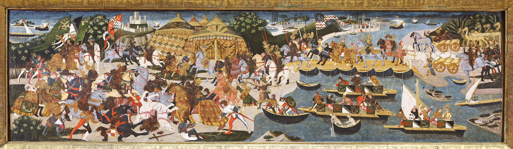 The panel support, of a horizontal wood grain, has been reduced to a depth varying from 1.3 to 1.7 centimeters, cradled, and waxed. Like its companion panel (see Apollonio di Giovanni, The Shipwreck of Aeneas), a 1.5-centimeter-thick engaged frame molding along all four sides is original but has been regessoed and regilt. There is no visible seam joining planks in the support, but numerous diagonal splits are visible through the paint surface and have been repaired with old repaints. Unlike its companion panel, this painting was not cleaned in 1951 and is in remarkably good condition. Losses are confined to the usual percussion damages suffered by cassone panels in general. The gilt decoration is beautifully preserved.1