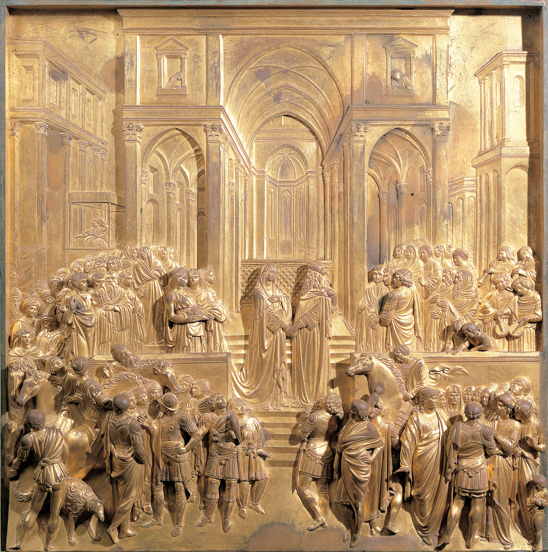 The story came to be treated in Christian Europe as a prefiguration or antetype for the Journey and Adoration of the Magi. In Renaissance Florence, where the Feast of the Magi (January 6) was commemorated with a parade of special magnificence, the meeting between King Solomon and the queen of Sheba assumed the status of a canonical Old Testament episode and was included by Lorenzo Ghiberti among the later reliefs cast for the north doors of the Baptistery, the so-called Gates of Paradise (fig. 1). It also assumed a special significance within the standard imagery celebrating marriage rituals in mid-fifteenth-century Florence, no doubt as an augury of good fortune promised by the union of bride and groom.
