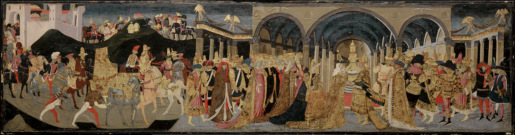 When it appeared on the front of painted cassoni, the Meeting of Solomon and the Queen of Sheba was usually paired with a subject apparently invented by cassone painters: the Journey of the Queen of Sheba. Three such pairs survive from Apollonio’s workshop: the Meeting in Boston (see fig. 2) may be connected with a Journey in the Birmingham Museum of Art, Alabama (fig. 3); the Meeting in the Crawford collection at Balcarres is paired with a Journey in the same collection;17 and the Meeting formerly in the Woodward and Butler collections was probably paired with a Journey formerly in the Merton collection at Maidenhead Thicket.18 One other version by Apollonio of the Journey of the Queen of Sheba is known, in the Museum of Fine Arts, Boston.19 It cannot be paired with a known panel of the Meeting of Solomon and the Queen of Sheba, but its existence implies that at least one such panel must be lost. It is not possible to say whether, as a spalliera meant to be situated above a cassone, the Yale panel, too, was once accompanied by a similar panel representing the Journey, nor is it possible to speculate what might have been the subjects of a pair of cassoni above which such a pair could have been installed. —LK