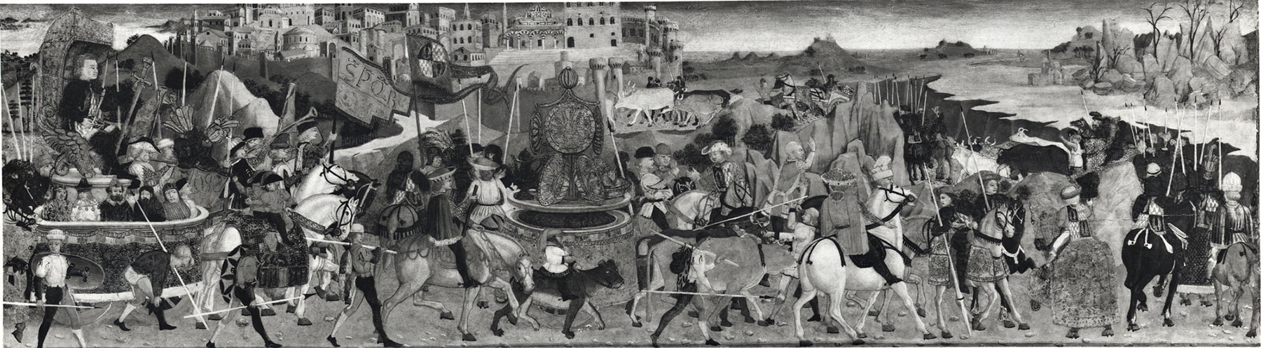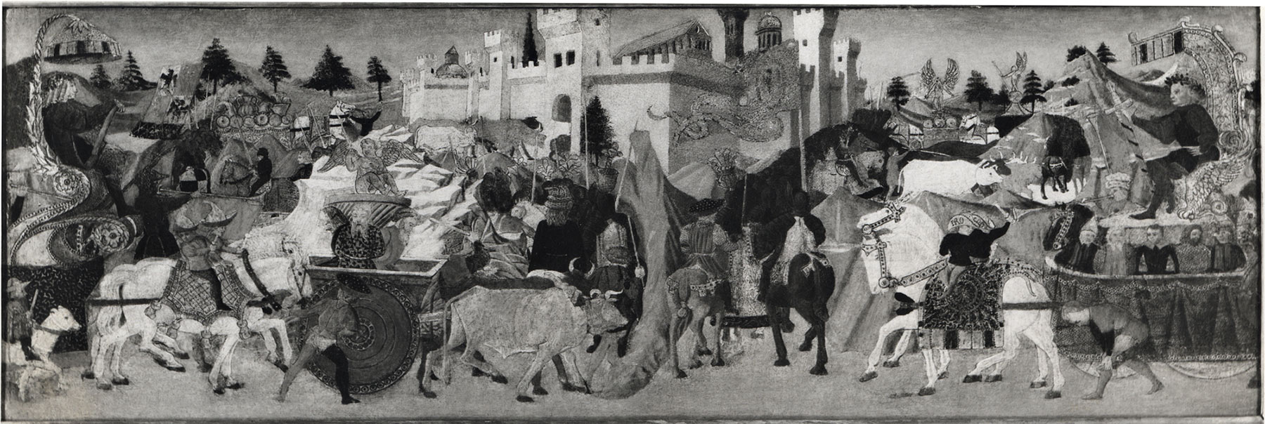 The Yale panel also stands apart from other images of military triumphs on cassone fronts in that at least one complete and two partial replicas of it are known, all originating from different artist’s studios. The complete replica, attributable to the workshop of Apollonio di Giovanni and Marco del Buono, was formerly in the collection of Sir Watkin Williams-Wynn (fig. 1).2 Measuring 40.7 by 120 centimeters, this panel accurately copies nearly every detail of the composition of the Yale panel. It differs only in simplifying the elegant draftsmanship and coloration of the original, suppressing the spatial function of landscape details, and altering the profile of buildings rising above the battlemented walls of the city in the background (specifically, in the area directly below the keyhole in the front of the original chest). So exact is the copy that it is necessary to assume that the artist of the Williams-Wynn panel had direct access to the Yale panel, either in the home of its original owner or as a member of the workshop in which it was painted. The partial replicas both occur on cassone fronts attributable to Giovanni di Ser Giovanni Guidi, called Lo Scheggia: one formerly in the collection of Franklin Mott Gunther and Louisa Facasanu, in Washington, D.C. (fig. 2),3 the other in the Musée National de la Renaissance in Écouen, France (which copies the double triumph motif, as Schubring had noted).4 In the former, the vignette of the right-hand triumphal cart with sword-bearing general and a ring of bound captives, the two white horses pulling it and their riders turning backward, and the soldier/attendant bending over to adjust his leggings in front of the cart are reproduced—in reverse and at the left of the adapted composition. The dwarf(?) riding an exotic if difficult to identify animal cropped at the left edge of the Yale panel reappears in the former Gunther-Facasanu panel as well, transposed to the center of the procession. Here, the borrowings are sufficiently generic to suggest that the artist could have been working with a drawing for or after the original, rather than relying on direct access to the painted source, and yet they are specific enough to leave no doubt that they rely directly on this prototype. The same drawing could have been used to create the Écouen cassone front, in which both carts and their horses, again reversed, are adapted, as is the detail of a page bending to fasten his leggings. This figure is otherwise an inexplicable addition to the narrative.5