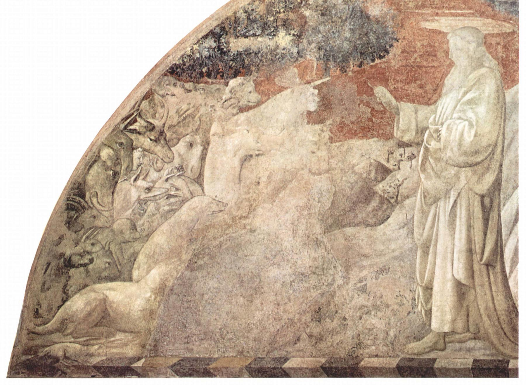 Among the bases for attributing the present panel to Paolo Uccello may be listed the free invention of the canopies adorning the two triumphal carts and the perfect radial foreshortening of their structures and of the plumes in helmets among the accompanying cavalry. Although similar devices appear in cassoni from other workshops, none reaches the level of geometric creativity and precision evident here. This is true as well of the sophisticated rendering of the battlemented city walls and towers and of the floriated decoration on the edges of the pyramid within the city; an identical form appears also in the background of Uccello’s frescoes in the Cappella dell’Assunta in Prato (ca. 1433–34). The turn of horses and oxen backward into space and the particular tonal gradations of the palette with which they are rendered, relying on the juxtaposition of contrasting planes of light and dark colors, are reminiscent of the Sir John Hawkwood monument (1436) in Florence Cathedral or the San Romano battle scenes.9 Other oddities frequently encountered in Uccello’s work and rarely found elsewhere are the solecisms of horses with both near legs raised simultaneously—an idiosyncrasy for which the artist was criticized by Giorgio Vasari10 but which must have been deliberate and was, in all likelihood, tongue in cheek. The peculiar animal ridden by a small figure at the left edge of the composition is an exact duplicate of one of the beasts at the top of the throng in the fresco of the Creation in the Chiostro Verde at Santa Maria Novella, Florence (fig. 3), and the facial types of the captives in both carts recur in numerous early works by Uccello, notably in the Quarate predella of ca. 1435.11 Such features argue not only for an attribution to Uccello but also for a date within the decade of the 1430s, close to the beginning of the artist’s career but, perhaps more significantly, at the start of the tradition of painting scenes from Roman history on wedding cassoni. It is quite possible that this panel represents a prototype for a fashion in domestic decoration that endured in Florence nearly to the end of the fifteenth century. —LK