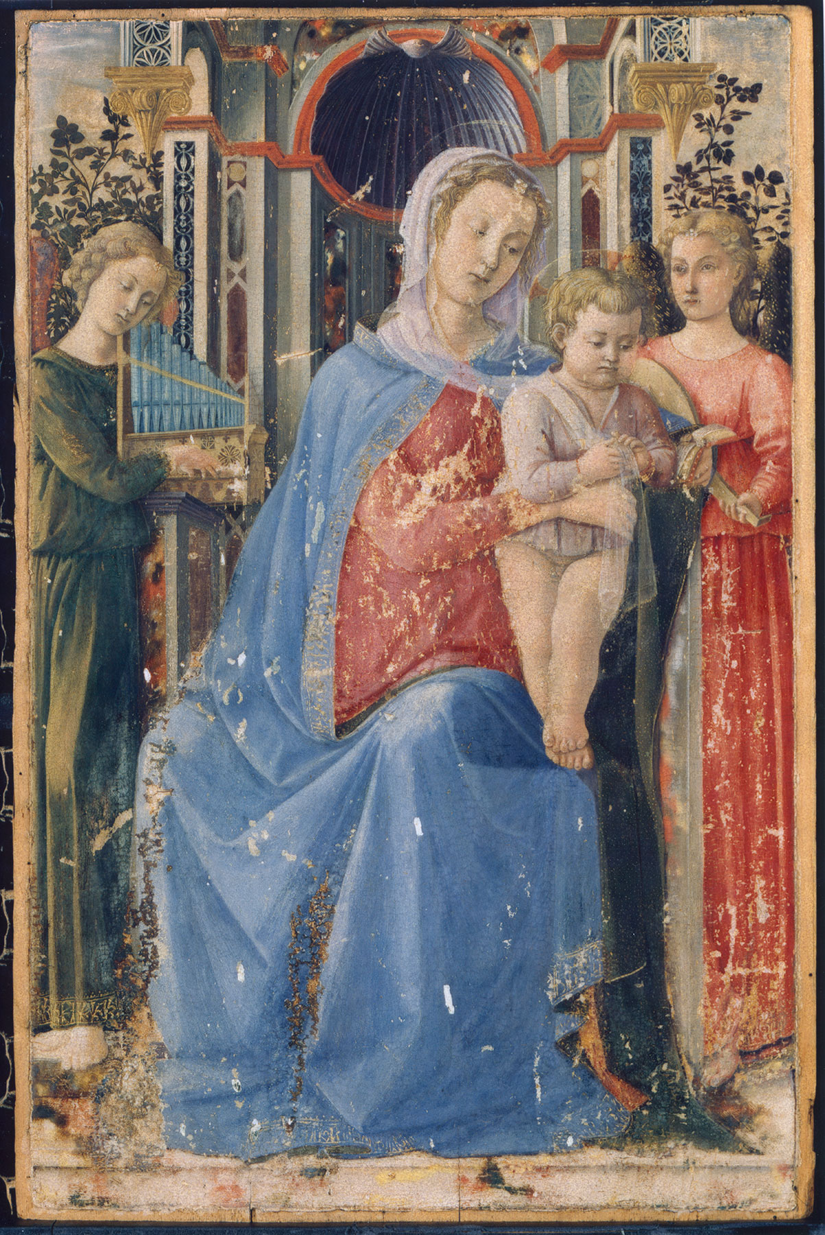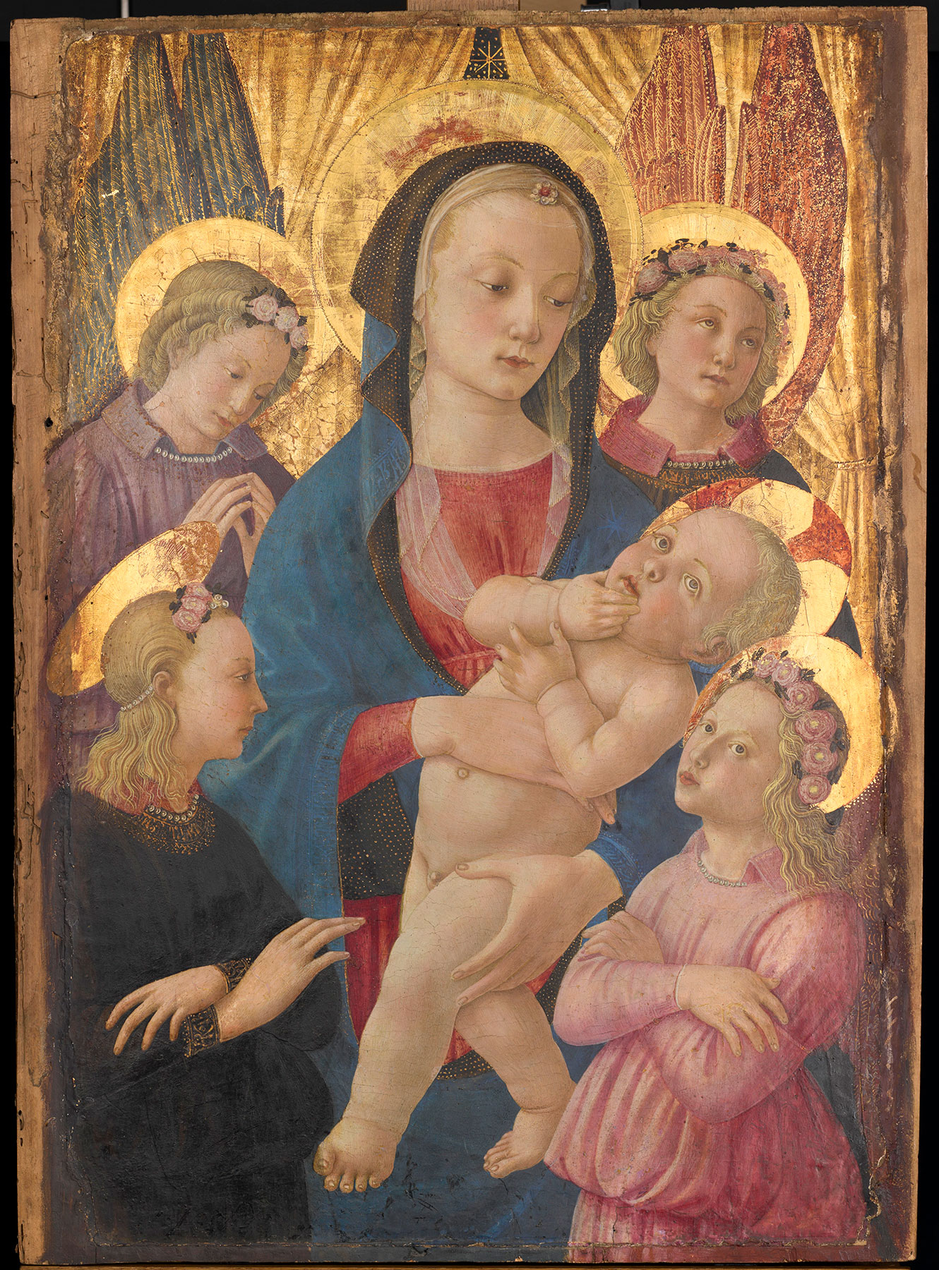 Pivotal to this difference of opinion is the hybrid, stylistically inconsistent nature of many of the works within the corpus of paintings generally accepted as by the Master of the Castello Nativity. One group of paintings, solidly if uninventively based on Filippo Lippi’s example, have been (probably correctly) recognized by both Lachi and Strehlke to relate so closely to the Master’s eponymous work that they are likely to be datable along with it to the 1460s, possibly extending into the early 1470s. A more inventive and original group of compositions—such as an extraordinary Virgin and Child with Four Angels in the Musée du Louvre, Paris (fig. 4)—was associated by Lachi, again probably correctly, with a hypothetical period of collaboration with Francesco Pesellino in the 1450s. The same author scattered a heterogeneous body of work between that period and a presumptive apprenticeship with Filippo Lippi in the 1440s. This last group includes the Faltugnano altarpiece (see fig. 3), the Yale painting, and another of the masterpieces attributed to this painter, a Madonna of Humility in the Museo Nazionale di San Matteo in Pisa (fig. 5). For Lachi, the dating of this group is anchored by the documentation for the Faltugnano altarpiece before 1450.