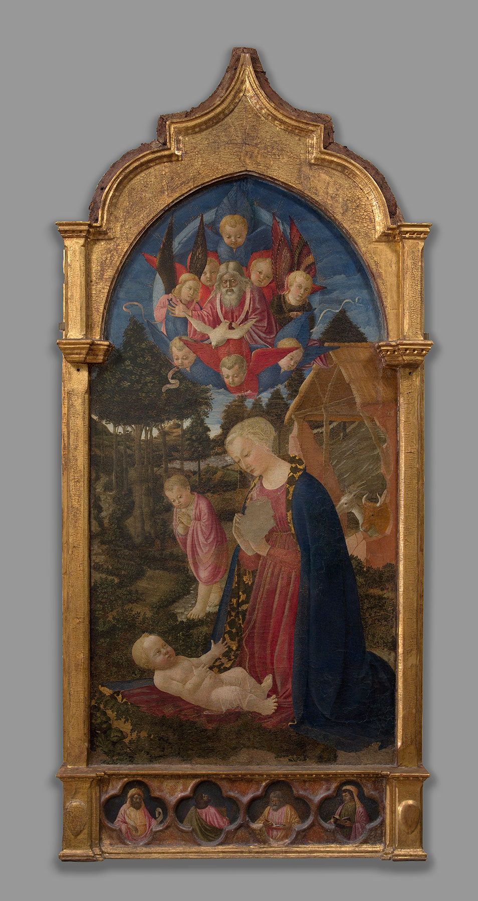 In his original compilation of works assigned to the Master of the Castello Nativity, Berenson asserted that the author of this group of paintings, primarily devotional images of the Virgin and Child, was an unknown Florentine artist active in the third quarter of the fifteenth century.6 He devised the conventional name for the Master from the most important member of the group: a relatively large colmo (tabernacle) depicting the Nativity or the Virgin Adoring the Christ Child, formerly in the Medici villa at Castello and now exhibited at the Galleria dell’Accademia in Florence (fig. 2). That painting retains its original frame, which is described in seventeenth-century inventories as bearing the arms (no longer legible) of Piero di Lorenzo de’ Medici and his wife, Lucrezia Tornabuoni, and which can therefore be dated sometime between their marriage in 1444 and Piero’s death in 1469. This range can be further delimited to the last decade of that span by the painting’s evident dependence on the composition of Filippo Lippi’s altarpiece of the Nativity from the Palazzo Medici (now Gemäldegalerie, Staatliche Museen zu Berlin7), of 1459. The core works attributed to the Master of the Castello Nativity all show a greater or lesser degree of dependence on Filippo Lippi in their style and, frequently, in borrowed motifs. Chiara Lachi, author of a doctoral thesis and the only published monograph on the artist, contended that the Master of the Castello Nativity first appeared as an independent painter as early as the mid-1440s and could be individuated before that among Lippi’s workshop assistants.8
