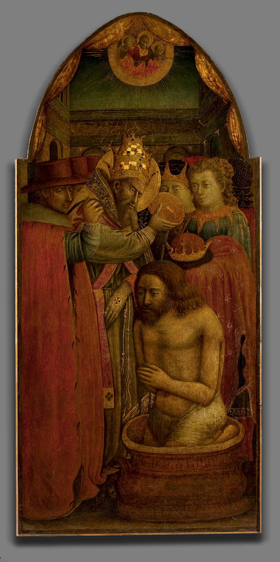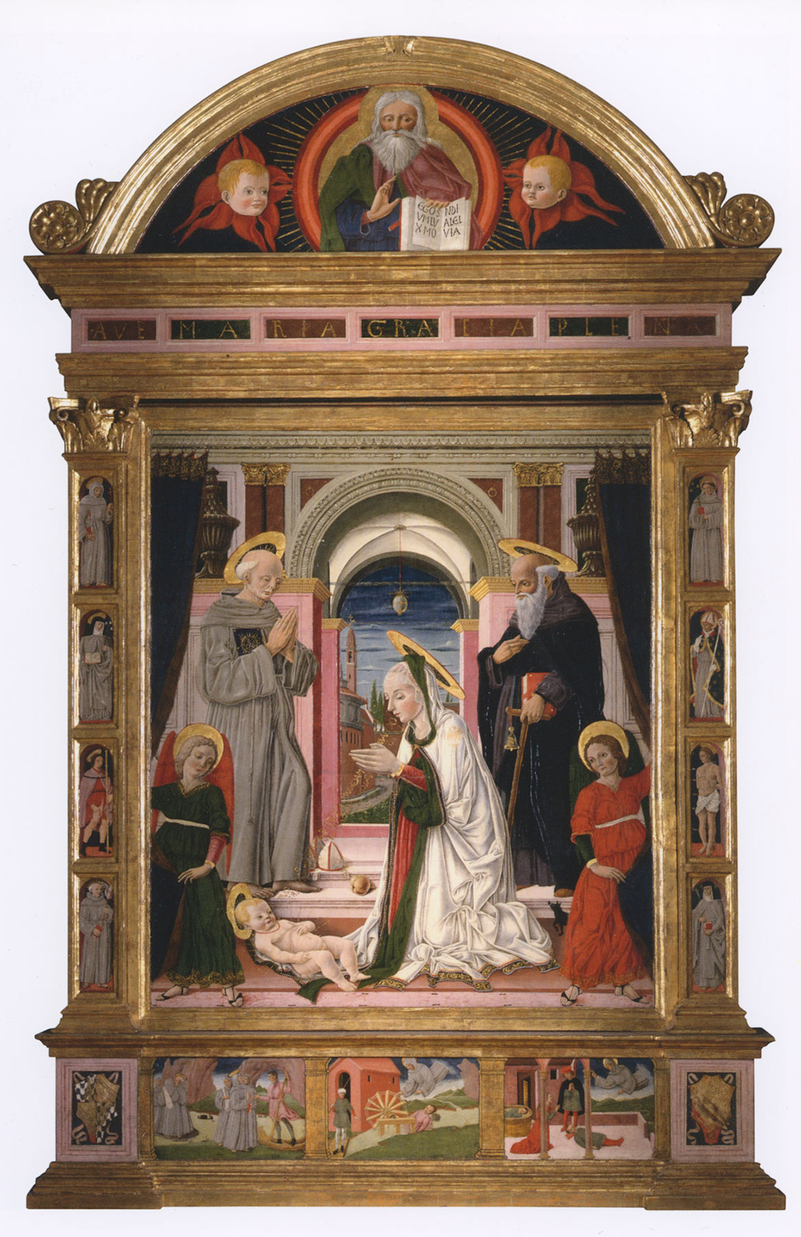 An alternative proposal by the present author18 that one of Pesellino’s compagni, either Piero di Lorenzo di Pratese or Zanobi di Migliore, was probably the artist responsible for two panels from an altarpiece triptych in the State Hermitage Museum, Saint Petersburg, showing Saint Sylvester Enthroned (fig. 6) and the Baptism of Constantine (fig. 7), as well as a related panel of the Crucifixion in the Musée du Petit Palais, Avignon, France,19 has not elicited comment in the literature. Reconstructing the Hermitage triptych as having been completed by Pesellino’s three predella panels showing episodes from the life of Saint Sylvester,20 the author supposed the works could be dated to the period of the compagnia, between 1453 and 1457, and also assigned responsibility for the Hermitage and Avignon panels to the Master of the Castello Nativity, based on the repetition of figural idiosyncrasies—specifically the pinched facial features with close-set eyes, upturned nose, and pursed lips—that characterize some of the latter’s works. This identification was too broad, however. Those features are undeniably similar but only occur in a limited number of works attributed to the Master of the Castello Nativity, above all in the Faltugnano (see fig. 3), Pisa (fig. 5), and Yale panels. Not only would this observation reinforce an argument for dating those paintings after 1453, but also it may indicate grounds for suggesting they could be the work of Pesellino’s second-named partner, Zanobi di Migliore. No signed or fully documented works survive by Zanobi di Migliore, who is known to have left the partnership with Pesellino sometime before 1457 and to have emigrated from Florence to Bologna in 1459.21 An altarpiece of the Virgin Adoring the Christ Child with Saints Bernardino and Anthony Abbot in the Pinacoteca Communale in Bologna (fig. 8), bearing the Bentivoglio arms quartered with Sforza on the pilaster bases of its original tabernacle frame, has been credibly attributed to Zanobi di Migliore.22 This painting, redolent of both Emilian and Florentine cultural influences, bears more than a casual relationship in its figure style to the Yale and Pisa paintings.