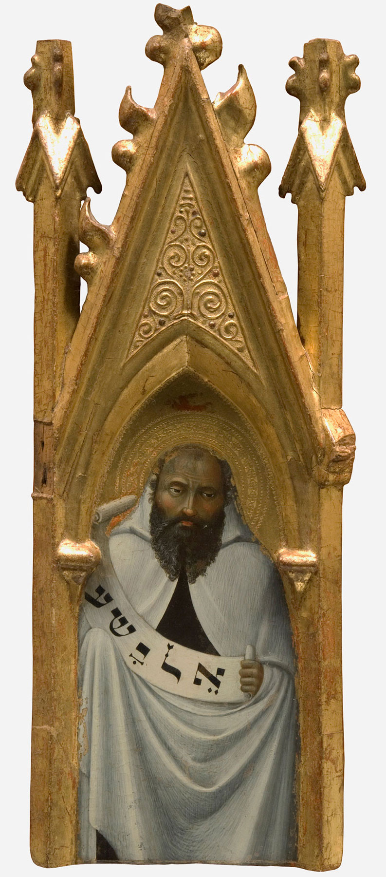Perkins believed that the painting might originally have functioned as a pinnacle to the Madonna of the Snows Altarpiece (fig. 2), documented as having been commissioned for the chapel of Saint Boniface in Siena Cathedral in 1430 and completed by 1432, and he therefore proposed a hypothetical provenance from Chiusdino, where the main panel of that altarpiece was then housed.5 In 1913 he submitted a brief notice to Rassegna d’arte calling attention to an Annunciatory Angel by Sassetta in Massa Marittima (fig. 3) that must have been a corresponding pinnacle from the opposite side of the same altarpiece. While the relationship of the Angel to the Virgin is self-evident, Perkins’s opinion that they were fragments of the Madonna of the Snows Altarpiece was merely supposition; it was repeated, however, without challenge for the next forty years by all authors, who presumed that a missing central pinnacle representing the Blessing Redeemer might yet be found, as such a figure (although unaccompanied by an Annunciation group) is specified in Sassetta’s original contract.6 Although this reconstruction resurfaced sporadically in subsequent literature,7 it was contested by Federico Zeri in 1956 on the grounds that the essentially Renaissance, unified field structure of the Madonna of the Snows would not have been surmounted by three overtly Gothic pinnacles.8 Beyond the intellectual incongruity of such a juxtaposition, Zeri contended that the two known pinnacle panels are earlier in style than the Madonna of the Snows. Presuming them to be among Sassetta’s earliest works, he proposed instead that they formed part of the dispersed altarpiece painted between 1423 and 1426 for the Arte della Lana, most of the surviving fragments of which are today in the Pinacoteca Nazionale, Siena. Adding credibility to this proposal was the fact that two of the small pinnacles from the Arte della Lana altarpiece, representing half-length figures of the prophets Elijah and Elisha (fig. 4), are vaguely similar in shape to the Yale and Massa Marittima pinnacles.
