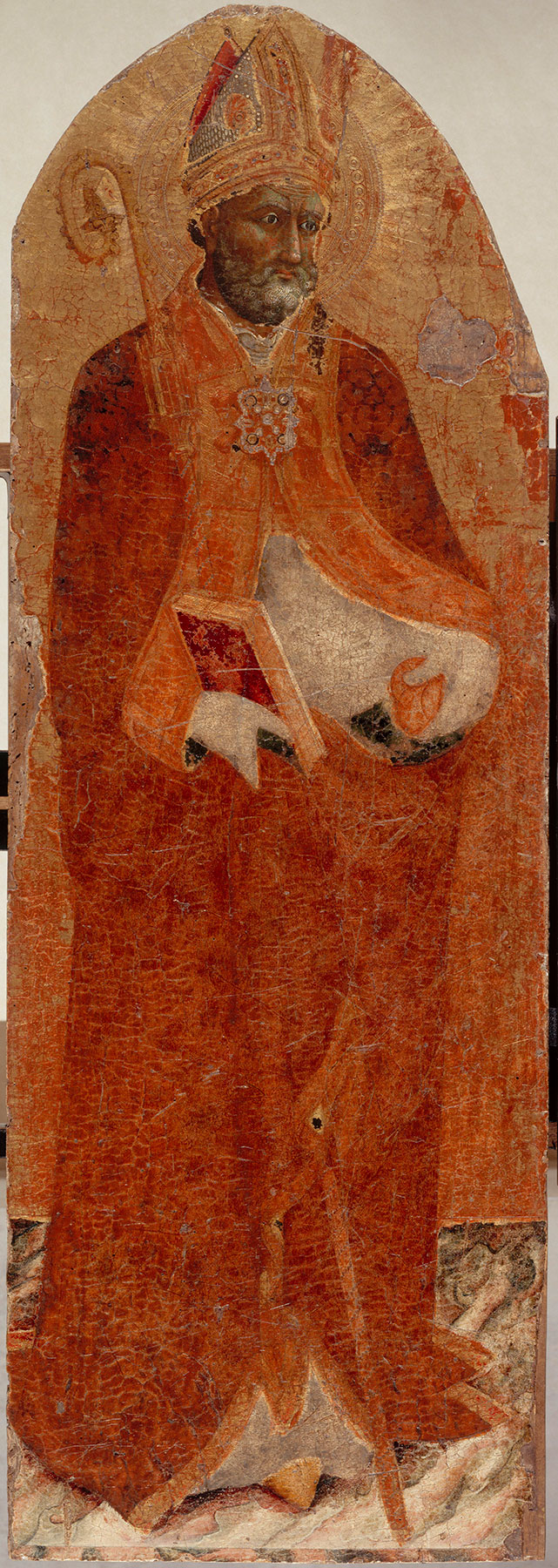 Zeri’s argument was in part based on internal visual evidence and in part formulated to accommodate a full-length figure of Saint Anthony Abbot by Sassetta now in the collection of the Monte dei Paschi di Siena (fig. 5), which he and Roberto Longhi had recently discovered in a private collection in Florence. He wished to identify the Saint Anthony as one of two lateral panels to the Arte della Lana altarpiece—the other would have represented Saint Thomas Aquinas—as described in eighteenth-century sources, which also mention Annunciation pinnacles.9 Zeri’s argument was based on sound stylistic observations, but it was accepted in full only by Enzo Carli10 and was dispelled entirely in 1982, when the Musée du Louvre, Paris, acquired a full-length image of Saint Nicholas of Bari by Sassetta (fig. 6) that is obviously a companion to the Saint Anthony Abbot. Rejecting any association with the Arte della Lana altarpiece, Claudie Ressort elected to extend Zeri’s identification of the Yale and Massa Marittima panels as pinnacles to the newly discovered Saint Nicholas and the Saint Anthony Abbot.11 She also accepted John Pope-Hennessy’s opinion (in correspondence with her) that the two full-length Saints were later works by Sassetta, painted probably after the Madonna of the Snows Altarpiece and, together with a fragmentary Madonna with Cherries in the Museo archeologico e d’arte della Maremma, Grosseto, possibly remnants of an altarpiece painted for the Petroni Chapel in San Francesco, Siena. Keith Christiansen, acknowledging that the Saint Nicholas and Saint Anthony Abbot cannot have been part of the Arte della Lana altarpiece but declining to speculate on alternative proposals for their origin, noted that the Saint Anthony panel is beveled at its top, tapering to a width too small to have accommodated the Yale or Massa Marittima pinnacles.12 He returned the pinnacles to the Madonna of the Snows Altarpiece, notwithstanding physical evidence13—of which he may have been unaware—that the Madonna of the Snows did not have conventional pinnacles.
