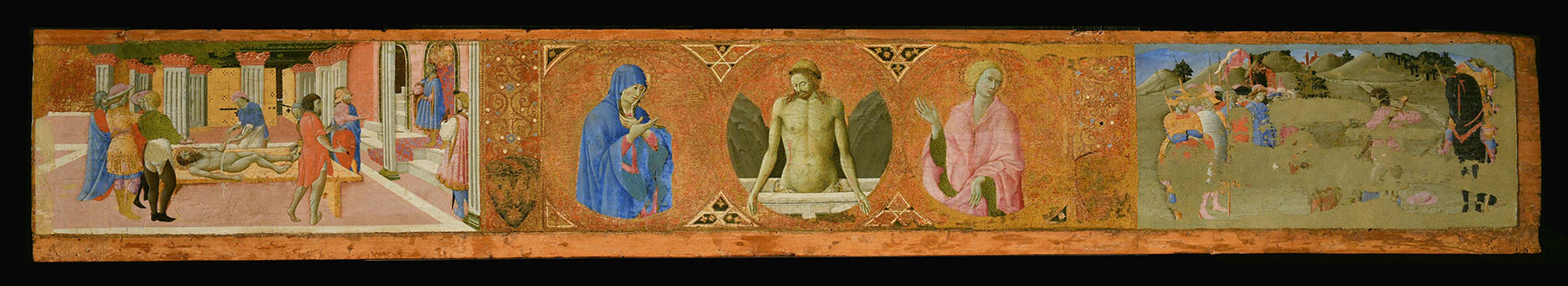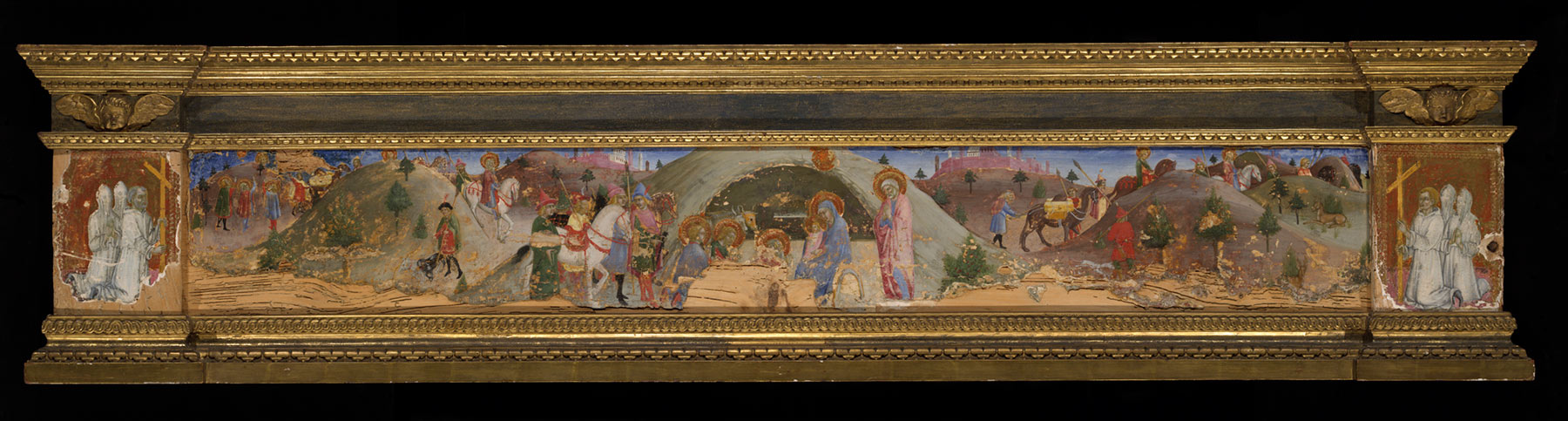 Unusual both for containing a single narrative subject stretched the full length of an altarpiece predella and for not having been cut into smaller fragments when it was dismantled from its original structure (fig. 1), this panel portrays various episodes in the story of the Adoration of the Magi, spread across a hilly landscape reminiscent of the Crete Senesi southeast of Siena. In the background at the far left, the three Magi point upward to a vision of the Star of Bethlehem in the sky, which is painted confusingly close to a haloed head appearing above the profile of a hill: the hindmost Magus beginning his journey, which continues with his two companions and their retinue filing through the landscape toward the right. The horsemen, their retainers, and their servants are seen again in a vignette in the middle ground at the right; these preliminary scenes are punctuated by a genre detail of a huntsman with dogs, standing in front of the hills behind which the train of the Magi processes. In the center of the composition, the Magi arrive at their destination. The Virgin is seated on a saddle placed on the ground before the manger, which fills a cave opening behind her. The Star of Bethlehem hovers above her head. She and the Christ Child on her lap regard the kneeling kings before them to the left, while Saint Joseph stands reverently behind them at the right. Singularly among all of Sano di Pietro’s versions of the Nativity or Adoration of the Magi, Saint Joseph is bearded and elderly but not bald. At the far left and right of the predella, painted on separate, vertically grained blocks affixed to the horizontal panel support, are two groups of three confraternity members clad in white and kneeling on a pink pavement, adoring the holy scene unfolding between them (see Sano di Pietro, Three Kneeling Confraternity Members; and Sano di Pietro, Three Kneeling Confraternity Members). Each group includes two fully hooded members behind one member whose cowl is thrown back: a younger man on the right and a bearded and balding older man on the left. The two unhooded figures each hold a large wooden cross with nails driven into the ends of its transverse arms. Both end blocks, which served as bases beneath the framing pilasters of the altarpiece from which this predella comes, have gilt backgrounds with punched margins running the full height of the panel at either side and across the top.1