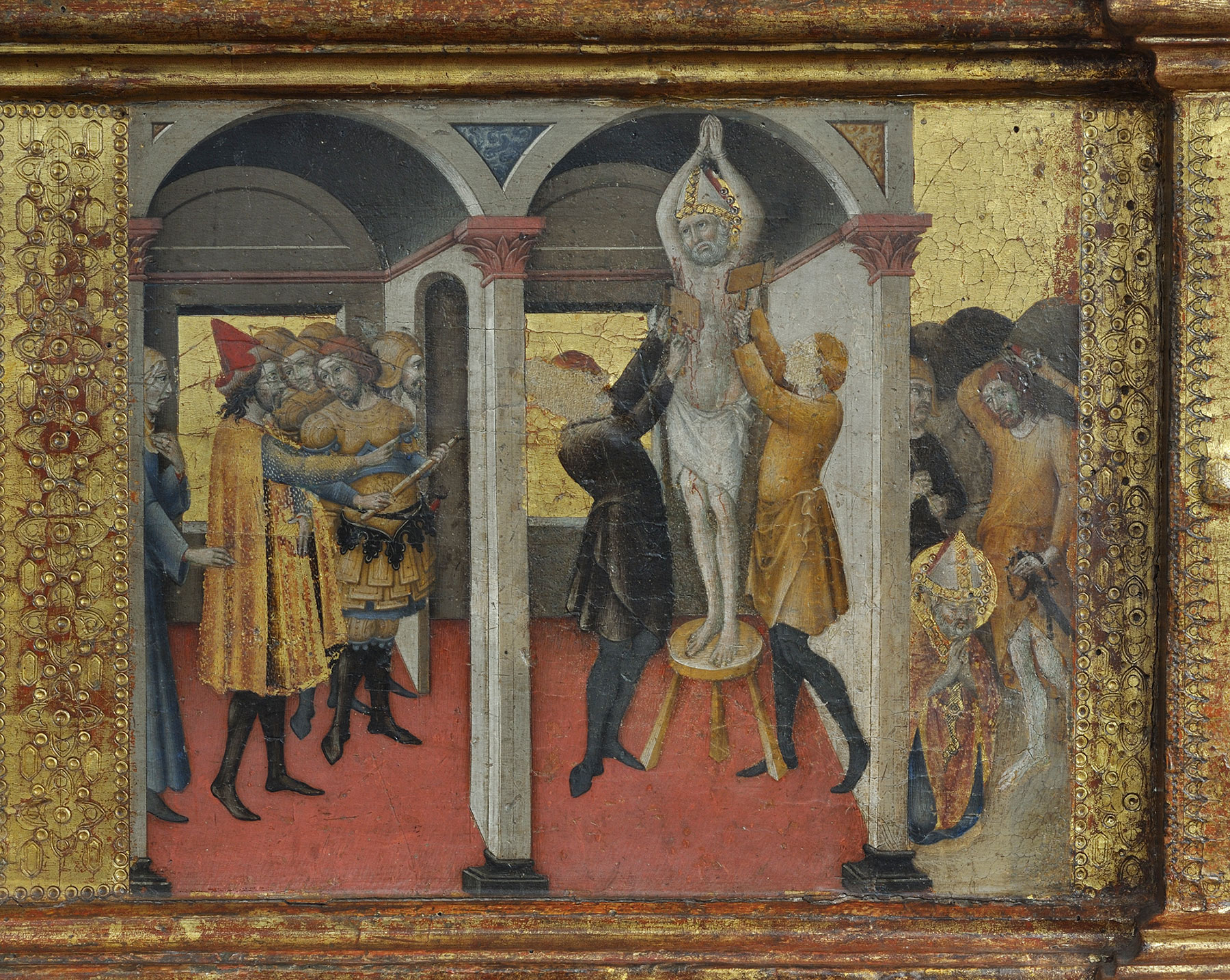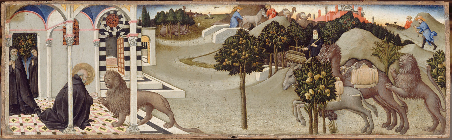 This important panel essentially disappeared from the literature of Sienese fifteenth-century painting after its drastic cleaning in 1971 and the absurd decision to leave it in its current dilapidated state, with the surface of the panel support exposed following the unwarranted removal of original layers of linen and gesso. Notwithstanding the claim that the cleaning revealed Sano’s authorship, which “could be surmised only a little earlier because of the heavy overpainting,”2 there has never, since its first publication by James Jackson Jarves in 1860,3 been any doubt of the attribution to Sano, and no other artist’s name has ever been associated with this painting. F. Mason Perkins was particularly taken with the landscape background, writing of the “delizioso paesaggio, la quale è, per gaiezza e purità di colore, nitidezza di esecuzione e poesia di sentimento, una delle cose più squisite, non solamente dell’arte di Sano, ma di tutto il Quattrocento senese” (delicious landscape, which for the gaiety and purity of its color, the refinement of its execution, and the poetry of its sentiment, is one of the most exquisite efforts not only of Sano but of the entire Sienese quattrocento).4 Few writers have concerned themselves with dating the work. Raimond van Marle, surprisingly, compared it to Sano’s late manner,5 and Émile Gaillard, with greater justification, cited the Saint Jerome predella in the Musée du Louvre, Paris (fig. 2)—now known to be part of an altarpiece dated 1444—as a parallel for the treatment of the distant city views in the landscape.6 Charles Seymour, Jr., first dated the predella ca. 1450, without mentioning any comparatives that led him to this conclusion, and later suggested that it might have been painted in the 1440s.7 It is, in fact, a distinguished work probably of the early 1450s, when Sano’s interest in landscape, in details of costume, and in variety of figural attitudes remained in full evidence, but clearly later than the lively narratives of the Saint Jerome predella in the Louvre or the Saint Bartholomew predella of 1447 in Siena (fig. 3). It most closely approaches the figure types and narrative structure of the Saint Blaise predella (fig. 4) beneath the Scrofiano altarpiece of 1449, although it is probably slightly later than that transitional work.