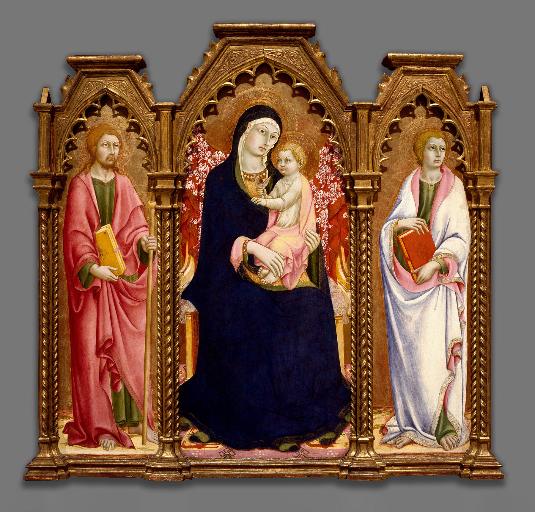 The high altar of the Compagnia’s chapel beneath the Spedale della Scala was dedicated to Saints Peter and Paul and was decorated in 1597 with an altarpiece by Alessandro Casolani featuring those two saints alongside the enthroned Virgin and Child, with Saints Catherine of Alexandria and Catherine of Siena in the background.12 An earlier altarpiece triptych belonging to the Compagnia, painted by Niccolò di Ser Sozzo probably in the 1350s, also features Saints Peter and Paul in its lateral panels and Saint Catherine of Alexandria (with Saint Anthony Abbot) kneeling at the feet of the Virgin in the center panel. This triptych may be presumed to have served as the high altarpiece for the confraternal chapel until the altar was remodeled around 1590, the occasion for the commission to Casolani.13 It is also possible that Sano di Pietro’s altarpiece from which the present predella comes—if indeed it was painted for this confraternal chapel—may have supplanted the altarpiece by Niccolò di Ser Sozzo and may have been replaced, in turn, by that of Alessandro Casolani. A late seventeenth- or early eighteenth-century manuscript history of the confraternity, however, states that, at that time, there were five altars in the chapel.14 It is unclear how many of these might have existed in the fifteenth century, and it is equally uncertain that Sano’s altarpiece stood in this chapel as opposed to one of the other benefices controlled by the confraternity, such as the Ospedale dei Santi Gregorio e Niccolò del Sasso, known as the Hospital of Monnagnese; the Ospedale di Uopini, which the confraternity inherited from Giovanni Colombini and the order of the Gesuati; or the Ospedale di Gesù Cristo in the Pian dei Mantellini. Of the surviving altarpieces by Sano di Pietro, the closest in style and size to the Yale predella is a triptych now in the Brooklyn Museum, representing the Virgin and Child Enthroned with Saints James Major and John the Evangelist (fig. 5). This painting is to within one centimeter the same width as the Adoration of the Magi in the center of the Yale panel, but it is not certain whether the Brooklyn triptych is complete in its present form or whether it might once have included two or more additional lateral panels with further saints. It has also not yet been possible to connect any of the altars for which the confraternity was responsible with a dedication to Saints James and John.15 —LK