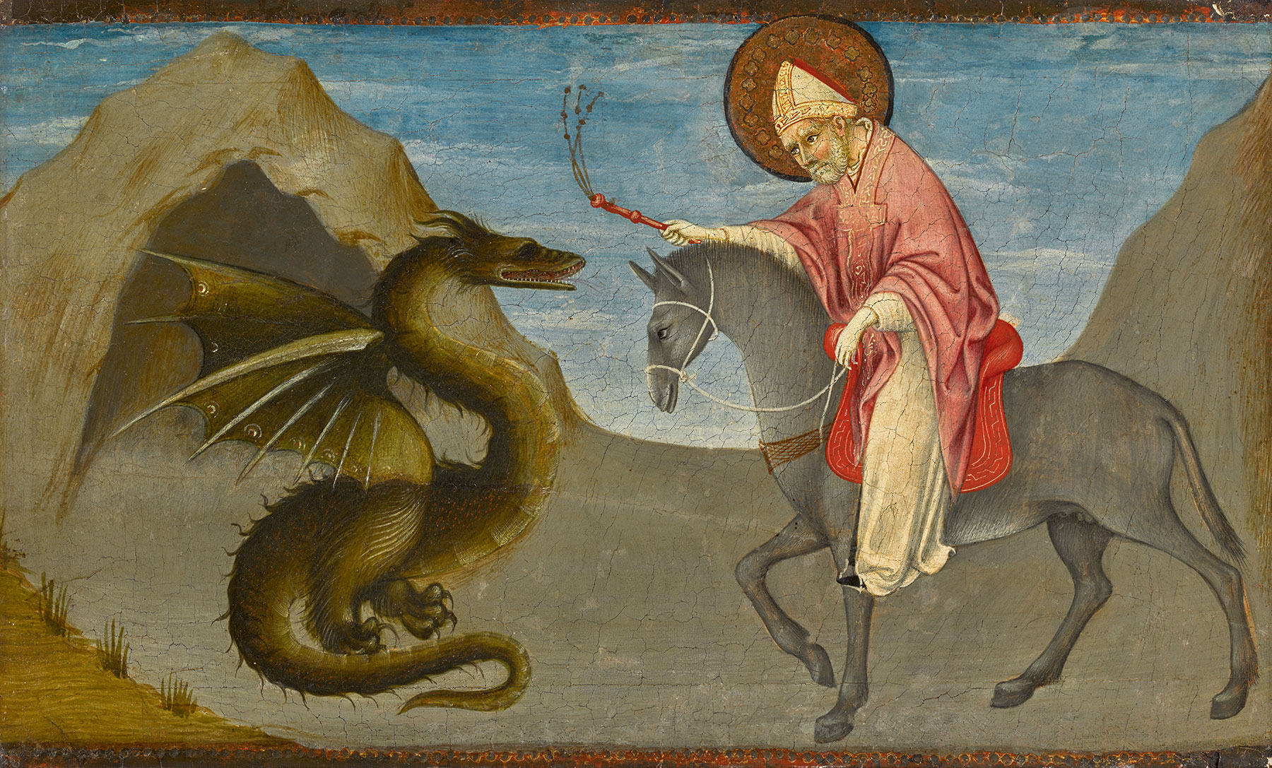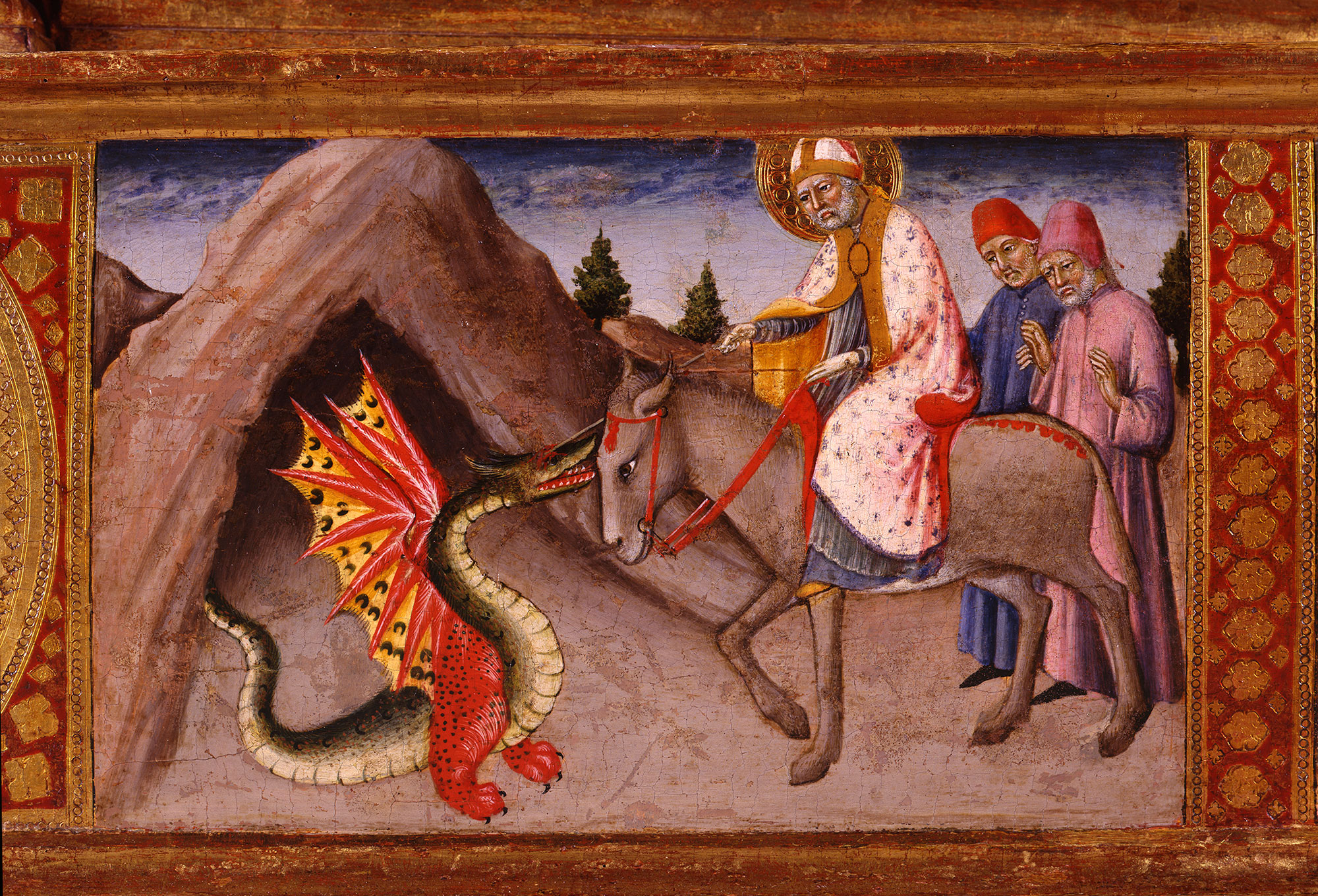The predella panel formerly in the Hyland collection represents an episode in the life of Saint Donatus, a fourth-century bishop of Arezzo. According to the Golden Legend, “A certain spring was so polluted that anyone who drank from it died immediately. Saint Donatus, mounted on his ass, was passing that way and purified the water by his prayer, whereupon a frightful dragon burst out of the spring, coiled its tail around the ass’s legs, and reared itself up against Donatus. The saint struck the beast with his whip . . . and killed it. He also prayed to the Lord, and all the poison was gone from the spring.”9 In the Hyland panel, the dragon has apparently emerged from the mouth of a cave before a river or pool at the left. Donatus, mounted on a horse rather than an ass and wearing his bishop’s miter and a rose-colored cope over a white surplice, swings a knotted whip at the dragon. The two animals and the holy bishop occupy nearly the full height and width of the panel in the foreground. In the Yale panel, a bishop wearing the same colors kneels before an executioner who swings back his sword, its discarded sheath on the ground between his legs. A group of soldiers at the left and a single soldier at the right carry large red shields emblazoned with a scorpion device. The commander of the troop at the left, dressed in blue over his gilded armor, presumably is meant to be the prefect Evadracianus, who ordered the saint’s beheading.