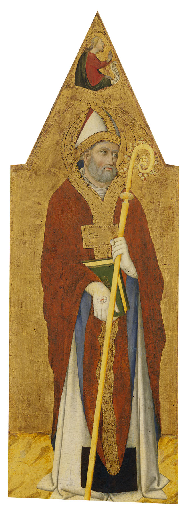 Although Sano di Pietro was a highly prolific artist, the number of altarpieces by him disassociated from their predellas and of predella fragments in search of an altarpiece is surprisingly small. Few of these altarpieces include a bishop saint not otherwise specifically identified by an attribute or an inscription who could perhaps be Saint Donatus. One such altarpiece, Polyptych 231 in the Pinacoteca Nazionale, Siena, includes a bishop saint invariably identified as Augustine in its rightmost lateral panel. As the figure wears black robes beneath his cope, this identification is probably correct. Another bishop saint conventionally identified as Augustine, from an altarpiece of which only two panels survive, both now in the Kress Collection at the Birmingham Museum of Art, Alabama (fig. 4), is instead dressed in white beneath his vermillion cope and might well have been intended to represent Donatus.10 The style and dimensions (118.1 × 41.1 cm) of the Birmingham saint are consonant with those of the Yale predella, supporting—although not demonstrating—the possibility of their reconstruction as parts of a single structure. The Birmingham Saints, whose backgrounds have been regilt, include half-length figures of the Annunciatory Angel and Virgin Annunciate in their gables. It is unclear whether they originally formed part of a triptych or pentaptych; neither the Virgin and Child that must once have stood between them nor a further pair of saints that might have stood alongside them have been identified.