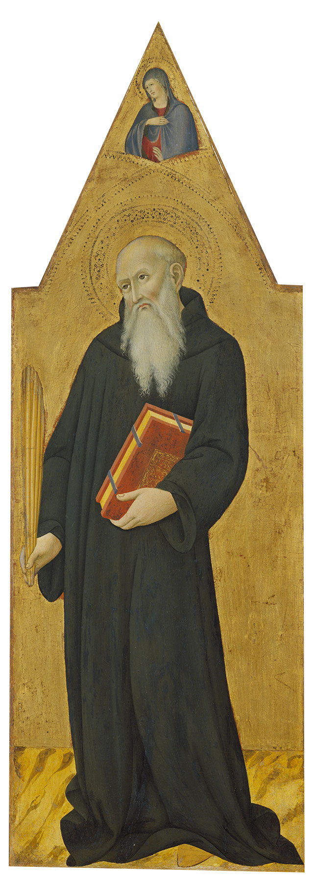 Aside from his prominence as protector saint of Arezzo, Donatus was the name-saint of numerous churches and small towns throughout Tuscany, including two within the walls of Siena: Sano di Pietro’s own parish church and the church of San Michele a Monte San Donato. The latter, now secularized and owned by the Monte dei Paschi di Siena, was built in the twelfth century and attached to a Vallombrosan monastery, since destroyed. Perhaps significantly, the bishop saint, possibly Donatus, in Birmingham, is accompanied by a full-length figure of Saint Benedict in a dark gray habit (fig. 5), which has suggested to some scholars that “the altarpiece to which the panels belonged may have been commissioned for a chapel or church associated with the Vallombrosan Order.”11 Gaudenz Freuler has, probably correctly, identified seven fragments of an altarpiece by Luca di Tommè that may have been painted for this church shortly after 1350.12 In his pastoral visit of 1575, Monsignor Francesco Bossi listed nine altars in this church, each provided with a painted altarpiece. He recorded three further altars with paintings in the parish church of San Donato, but none are described in sufficient detail to allow an identification with Sano di Pietro’s predella panels.13 —LK