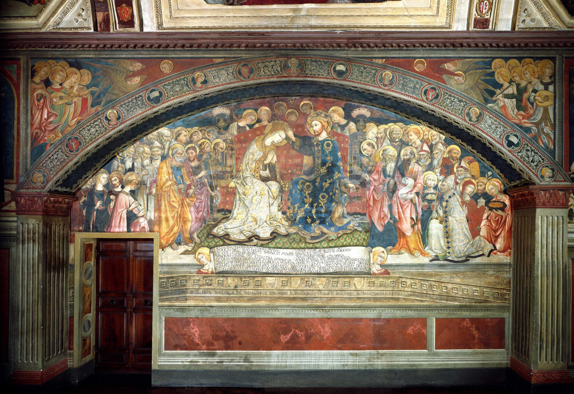 The subject of the Coronation of the Virgin enjoyed “a remarkable increase in popularity” in Siena around the middle of the fifteenth century, “symbolized by the total renewal by Domenico di Bartolo and Sano di Pietro in 1445 of a huge fresco with the Coronation painted by Lippo Vanni in 1352 on the left wall of the Sala del Biccherna of the Palazzo Pubblico” (fig. 1).3 An altarpiece by Giovanni di Paolo in Sant’Andrea, Siena, is dated 1445, and another in the Robert Lehman Collection at the Metropolitan Museum of Art, New York (fig. 2), must date shortly afterward. Sano di Pietro painted two monumental versions of the theme. One, an altarpiece now in the Pinacoteca Nazionale, Siena (fig. 3), has tentatively been identified with a commission of 1451 for a chapel in the Palazzo Pubblico.4 It follows closely the composition of Giovanni di Paolo’s altarpiece in the Lehman Collection, reproducing even the textile pattern on the cloth of honor lining the Virgin’s throne. The other, in Gualdo Tadino, includes smaller kneeling figures of Saint Jerome and the Blessed Giovanni Colombini in the foreground and is dated to 1473.5 One further example of a Coronation of the Virgin by Sano di Pietro, again in the Pinacoteca Nazionale, Siena, was probably designed as the pinnacle to an altarpiece.6 Painted with a gold ground and a slightly arched top, it includes no ancillary figures, yet the punched margin of the gilding implies that it has not been reduced in size.7