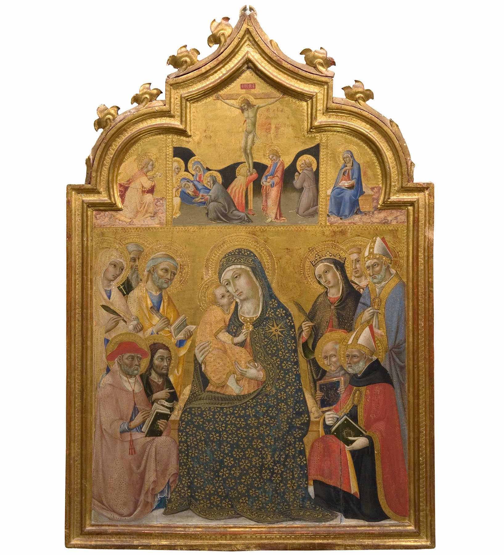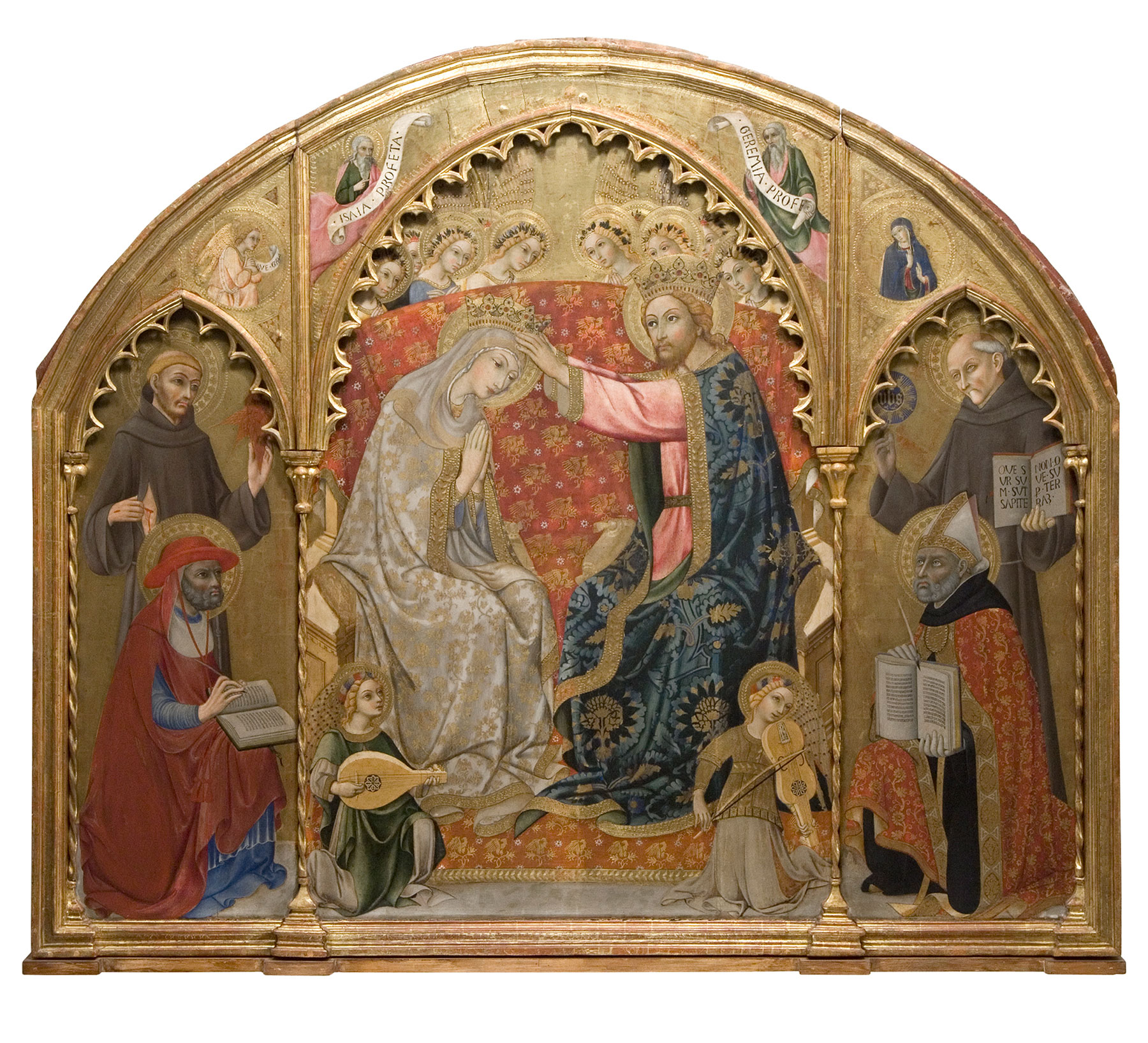 Sixteen saints stand alongside the throne, four ranks of two on either side. All are painted on a slightly larger scale than the angels but considerably smaller than Christ or the Virgin. Before and below them, in the lower corners of the composition, kneel Saints Bernardino (left) and Francis (right). The first row of saints is all female, two holding martyr’s palms and two (on the right) wearing crowns. Above and behind these are the four Fathers of the Church: Saints Jerome and Augustine on the left, Ambrose and Gregory on the right.2 A fragmentary halo is visible behind and between the latter pair, suggesting that the four figures are meant to be emblematic representatives of the larger order of Confessors, one of the choirs of saints invoked in the hymn “Te Deum Laudamus” recited on the Feast of All Saints. The third row of saints includes Saints John the Evangelist and Peter on the left. The pair opposite them is probably also meant to portray apostles. Although neither bears a distinguishing attribute, the figure furthest right resembles the type usually employed by Sano di Pietro to represent Saint Bartholomew, and the figure alongside him could be Saint Paul. A fragmentary halo appears between both pairs of figures in this row, once again implying that they are meant to be emblematic of the full chorus of apostles and Evangelists. The top row of saints may be prophets and patriarchs; all are elderly and bearded, but none bears an identifying attribute. Partially visible arcs of six more haloes on the right and two on the left suggest a crowd of holy figures completing the court of Heaven in attendance at the scene of the Coronation. Of the conventional orders of saints, only the martyrs are missing. Two of the virgins in the front row carry martyr’s palms, but others were probably intended to be suggested by the crowd of partial and overlapping haloes at the back. Conspicuous in their absence are any monastic saints other than the two Franciscans in the foreground and any figure who could plausibly be identified as Saint John the Baptist.