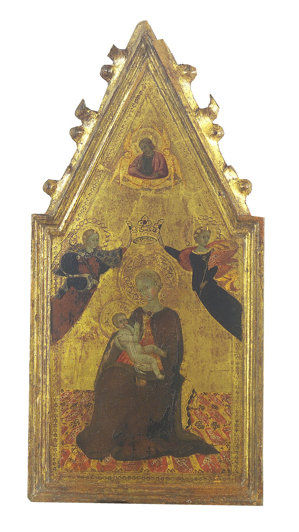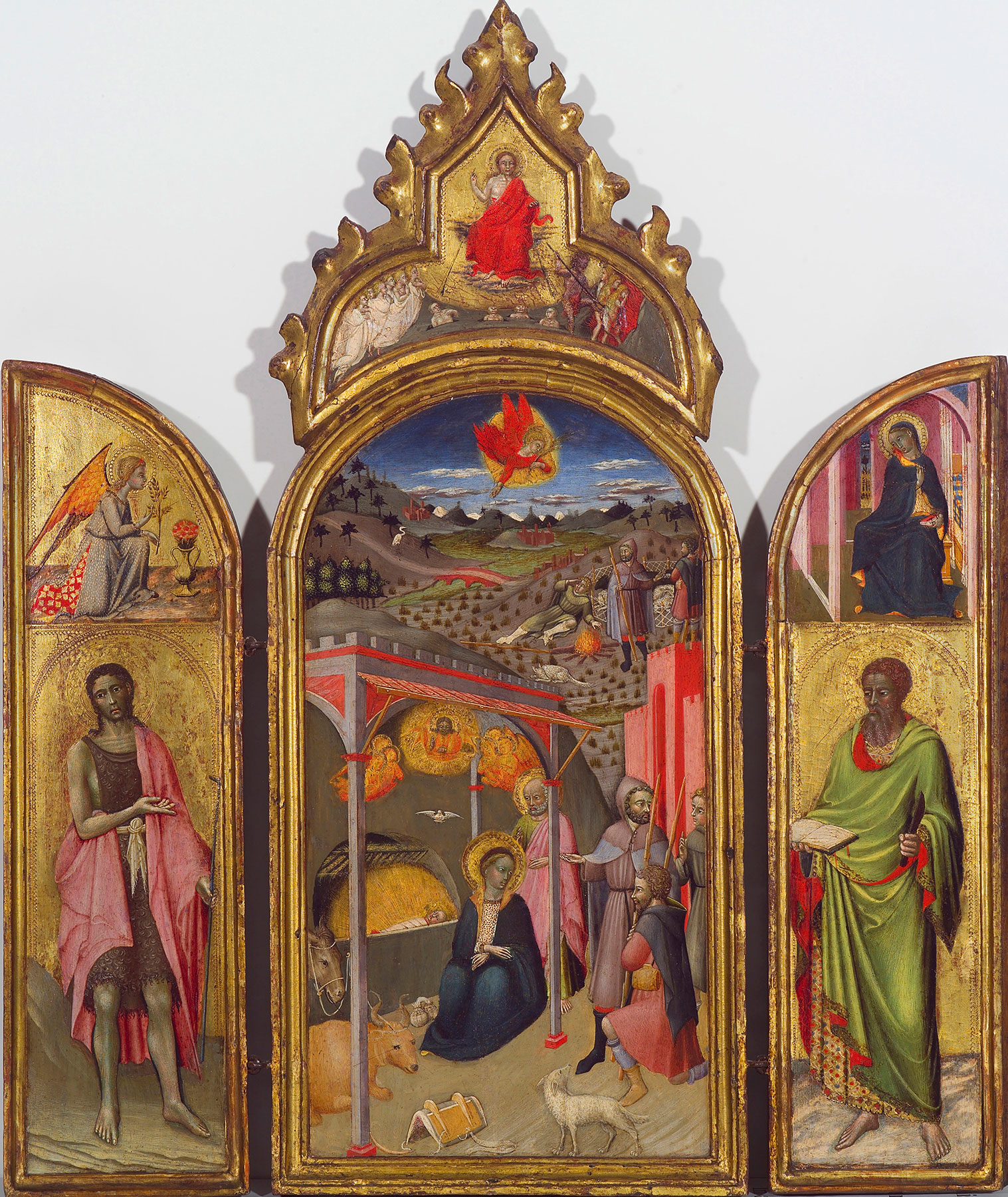 This triptych—of a notably fine level of craftsmanship in its carpentry, gilding, and painting, if not of equal merit for its artistic inventiveness—repeats a compositional formula well known in Sienese painting since the fourteenth century. The central panel shows the Virgin and Child Enthroned with two angels holding a crown above the Virgin’s head, a grouping loosely reminiscent of Sassetta’s Madonna of Humility installed in the Palazzo Pubblico in Siena in 1438 (see Giovanni di Paolo, Virgin and Child with Saints Bartholomew and Jerome, fig. 1).3 Full-length figures of Saints Peter and Jerome stand in front of the throne, flanking the Virgin on the left and right, respectively, while a half-length figure of the blessing God the Father appears in a mandorla of engraved lines in the pinnacle of the panel. The wings show two of the patron saints of Siena and two Franciscan saints, turned toward the figures in the center. On the left are Saint Ansanus, carrying a martyr’s palm and the Sienese Balzana, with Saint Francis kneeling before him in a pose usually encountered in scenes of the Stigmatization. On the right are Saint Sabinus, holding a banner with a rampant lion in gold on red, symbol of the Capitano del Popolo of Siena, with Saint Bernardino kneeling before him in a pose mirroring that of Saint Francis. The gables of the wings are filled with smaller-scale figures of the Annunciatory Angel and the Virgin Annunciate.