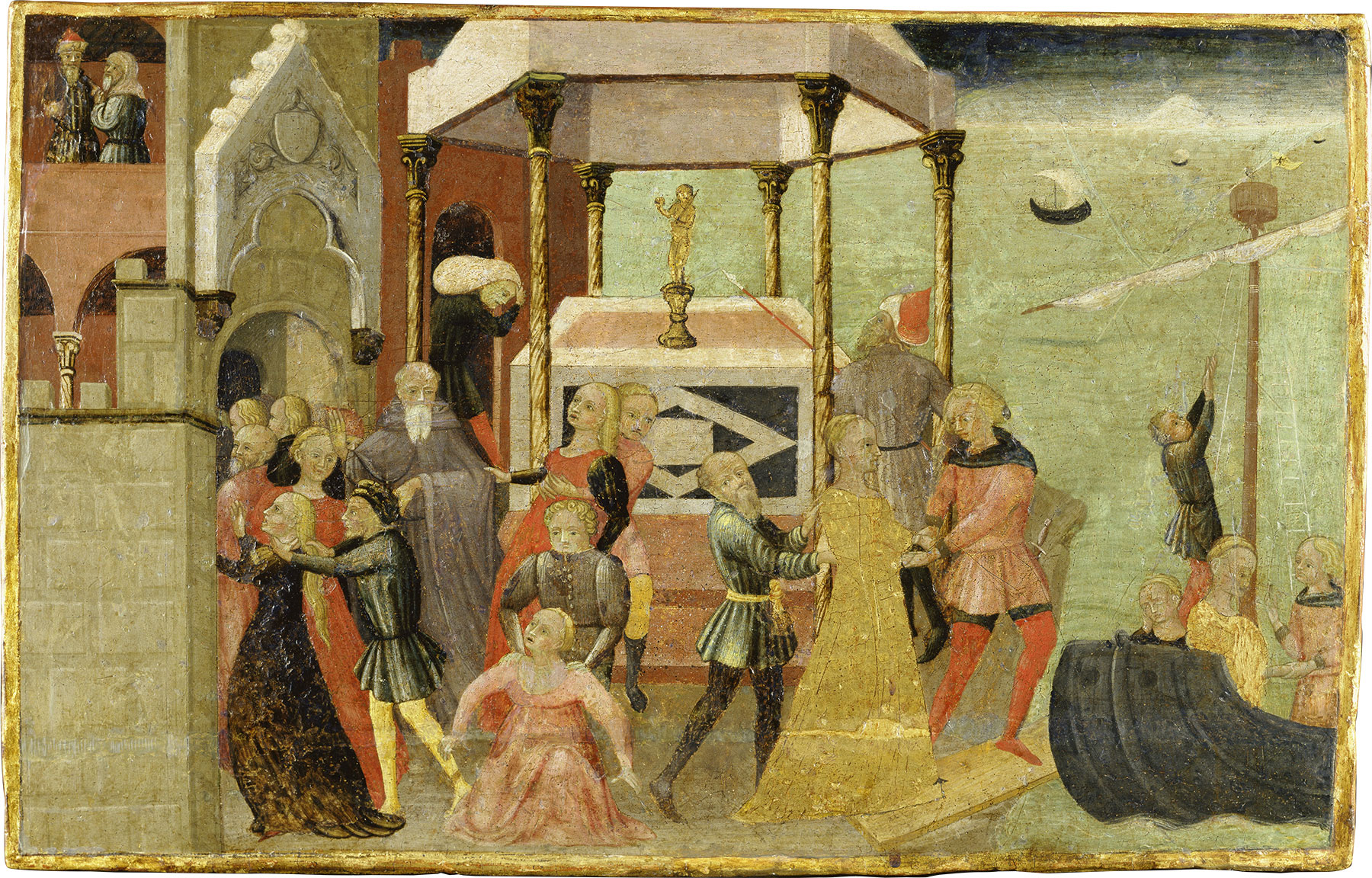 The triptych was first recorded—as formerly in the Galerie D’Atri, Paris—by Federico Zeri in his 1978 review of Piero Torriti’s catalogue of paintings in the Pinacoteca Nazionale, Siena.4 Zeri grouped it and five other works around a modest panel in the Siena Pinacoteca (fig. 1), correcting an effort that had been made forty years earlier by John Pope-Hennessy to identify one of the anonymous followers of Sassetta active in midcentury Siena.5 Zeri retained the name of convenience coined by Pope-Hennessy, “Master 185,” but rejected all but one of his attributions: a triptych formerly in the Smithsonian Institution, Washington, D.C.,6 subsequently (1997) in a private collection in Milan,7 representing the Virgin and Child Enthroned with Saints Michael and Nicholas of Bari. To these, he added another triptych, in the Broglio collection in Paris in 1951, representing the Madonna of Humility with four prophets and Saints Jerome and Thomas Aquinas, as well as two panels also representing the Madonna of Humility that presumably once stood at the centers of similar triptychs: one formerly (1976) in the collection of Heinz Kisters at Kreuzlingen, Switzerland,8 and the other, at the time, with Luigi Grassi on the London art market. Finally, he included with these paintings, all of which are similar in size and format, two fragments of a cassone front in the Städel Museum, Frankfurt (fig. 2), representing scenes of the Abduction of Helen of Troy.9 Although Rudolf Hiller von Gaertringen claimed that the Frankfurt panels are extraneous to the group, his argument is based on an unpersuasive dating of the panels three decades too early, invoking comparisons to Florentine cassoni that bear no relation to the development of the genre in Siena.10 Another cassone front, representing the story of Lucretia, once attributed by Bernard Berenson to Guidoccio Cozzarelli, was correctly recognized by Everett Fahy as a final addition to the corpus of work by Master 185.11