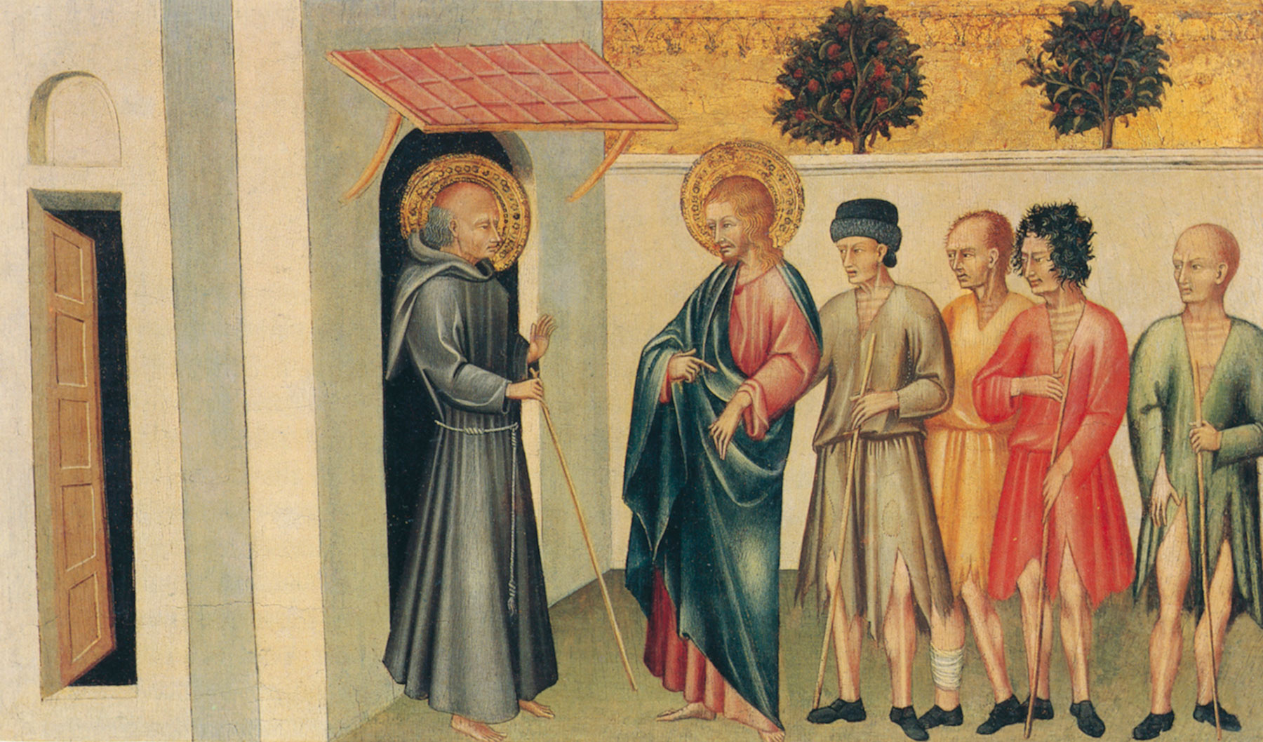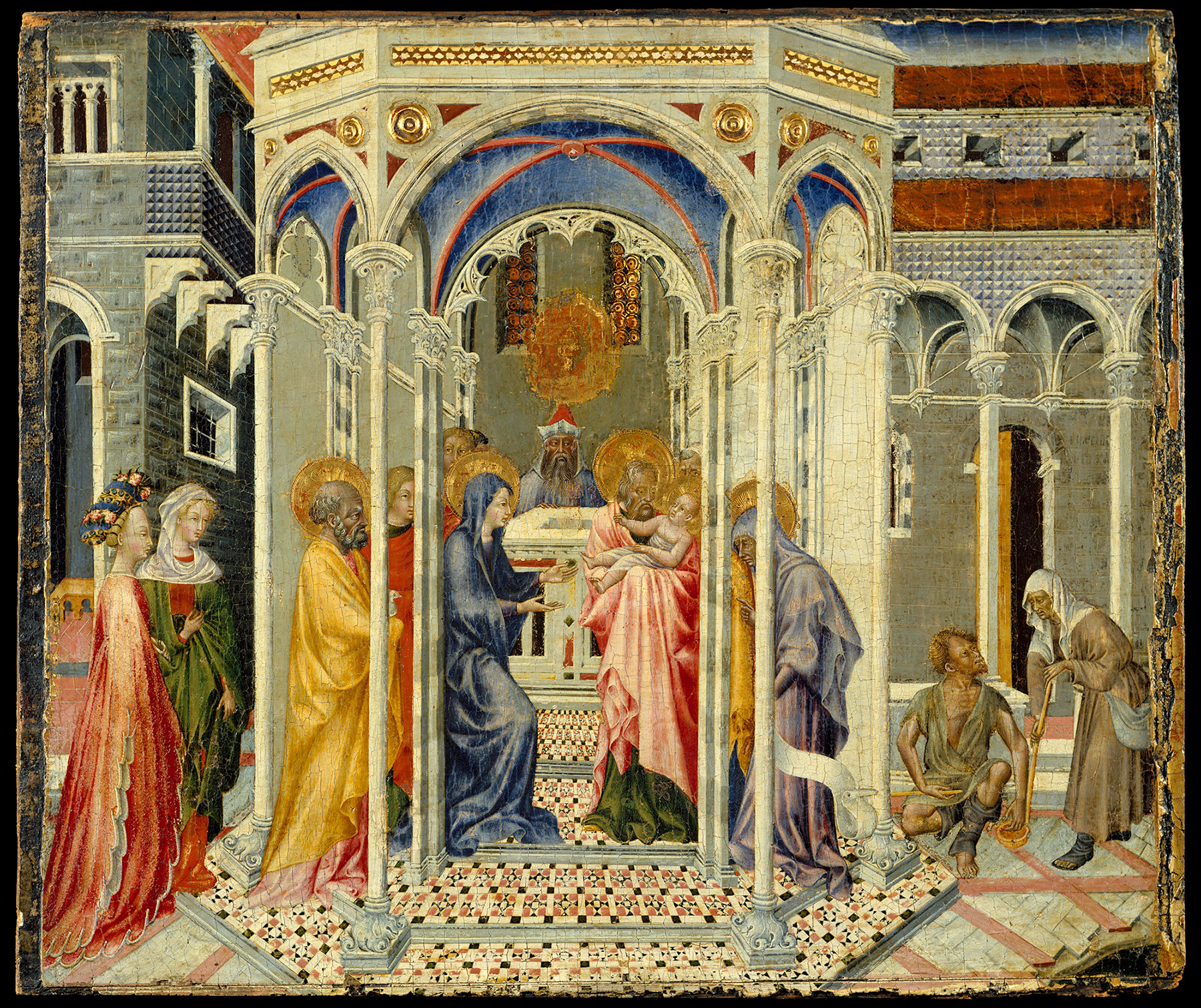 The Yale fresco, which is essentially a large brush drawing, displays all the bravura control of its materials and sensitivity to nuances of tone that are hallmarks of Giovanni di Paolo’s paintings throughout his career. There is no reason to doubt its autograph status. The “unattractive deformations of the human body” that led Faison to suppose it to have been painted after 1460 and that induced King and others to reject it as a work by the artist’s own hand must be understood as anachronistic appraisals inappropriately measuring the artist by the classicizing ideals in vogue in the 1930s. Similar liberties in anatomical proportions appear already in some of Giovanni di Paolo’s earliest narrative paintings; they are personal quirks rather than insufficiencies of quality or evidence of physical decline in old age. Nothing comparable to the svelte and youthful profiles of the five women clustered in the middle ground of the fresco at its center appears in any of Giovanni di Paolo’s late works, which are populated by monumental if stocky, craggy figures of highly expressionistic ruggedness. Nor are the smooth features of the king and the emperor(?) at the right at all like the angular, outsize heads of the male saints in Giovanni di Paolo’s late altarpieces. Analogous types to these and to the young peasant(?) at the left of the composition are encountered instead, on a much smaller scale, in the background figures of the Branchini predella of 1427 in the Pinacoteca Nazionale, Siena;13 in the predella panel of the Presentation in the Temple of ca. 1435 in the Metropolitan Museum of Art, New York (fig. 1); and, above all, in the two predella panels (location unknown) with scenes from the legend of an unidentified Franciscan saint—one showing the saint levitating before a crucifix and the other, particularly close to the Yale fresco, showing Saint James leading a group of pilgrims to his refuge (fig. 2)—probably painted in the early 1430s.