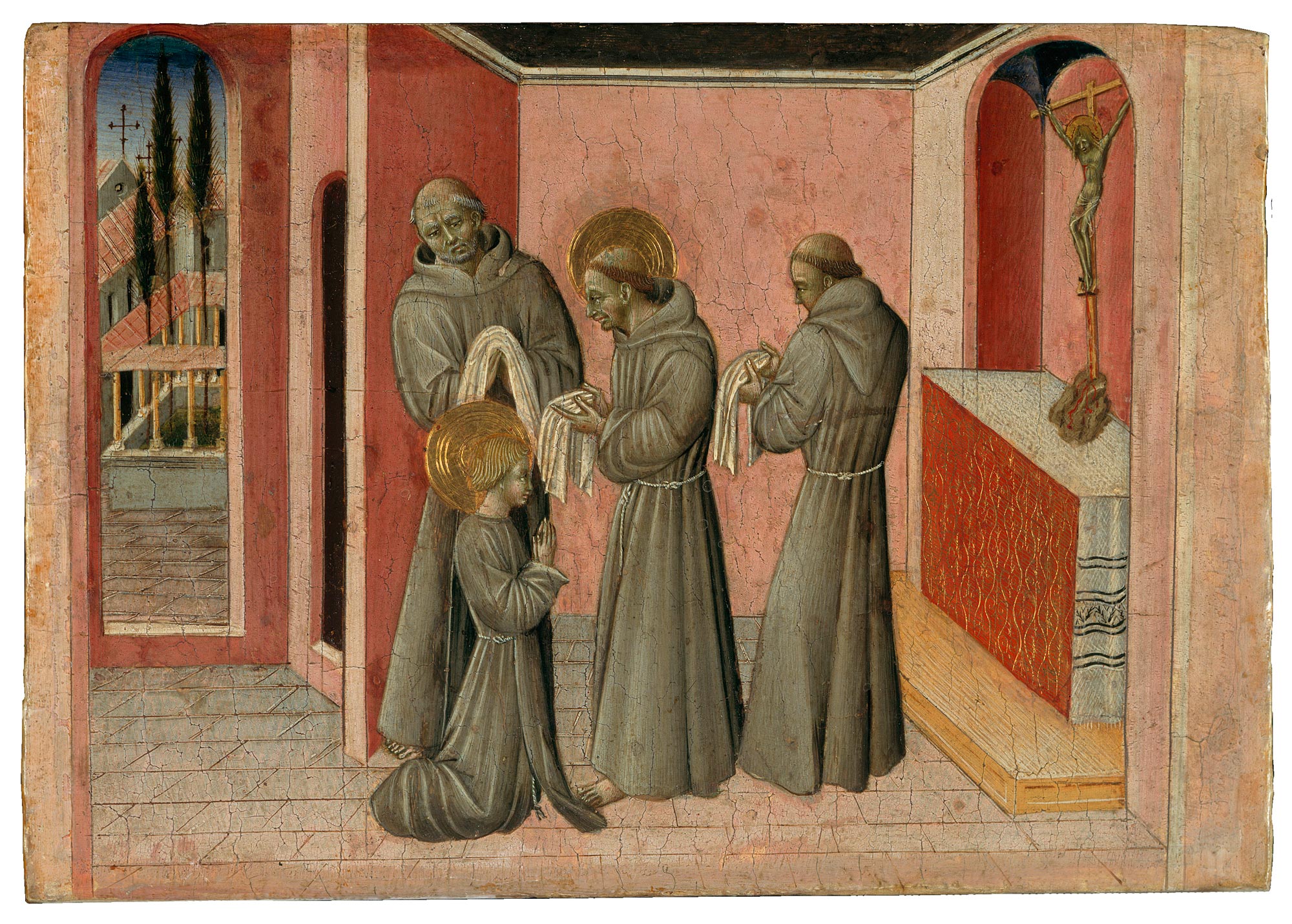 One of the few paintings in the James Jackson Jarves collection for which the artist was correctly identified by its owner, this scene from the life of Saint Clare has never been the topic of an attributional debate, although its subject was long misunderstood as being a scene from the life of Saint Catherine of Siena. The error was first rectified by John Pope-Hennessy,1 who recognized the painting’s subject as Saint Clare blessing the three loaves of bread, an imaginative conflation of texts derived from Thomas of Celano’s official biography of the saint, commissioned by Pope Alexander IV in 1257, and Fra Bartholomew of Pisa’s De conformitate vitae beati Francisci ad vitam Domini Iesu of 1399.2 Stopping at Assisi three days before her death in 1253, Pope Innocent IV and his retinue visited the bedridden Clare at the convent of San Damiano, where, according to Thomas of Celano, Clare humbly begged for permission to kiss the pontiff’s foot. Fra Bartholomew added that, shortly afterward, the pope asked Clare to bless the meal they were about to eat. She made the sign of the Cross over the prepared loaves of bread, and two audible cracks revealed the sign of the Cross visibly imprinted on each loaf. Giovanni di Paolo shows the saint on her knees before a refectory table set with a white linen cloth. She raises her right hand, two fingers extended in a gesture of blessing, while the pope, attended by a deacon dressed in blue and by two cardinals, recoils in surprise at the sound and the miraculous appearance of the crosses. The scene opens into depth at the left, with a compressed view of the overlapping facades of two conventual buildings.