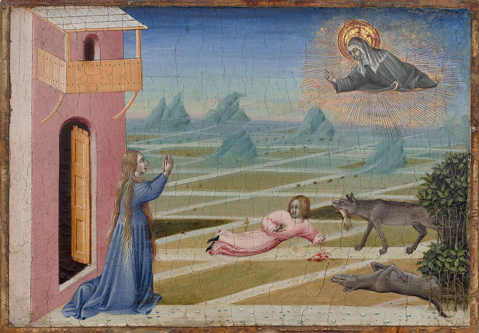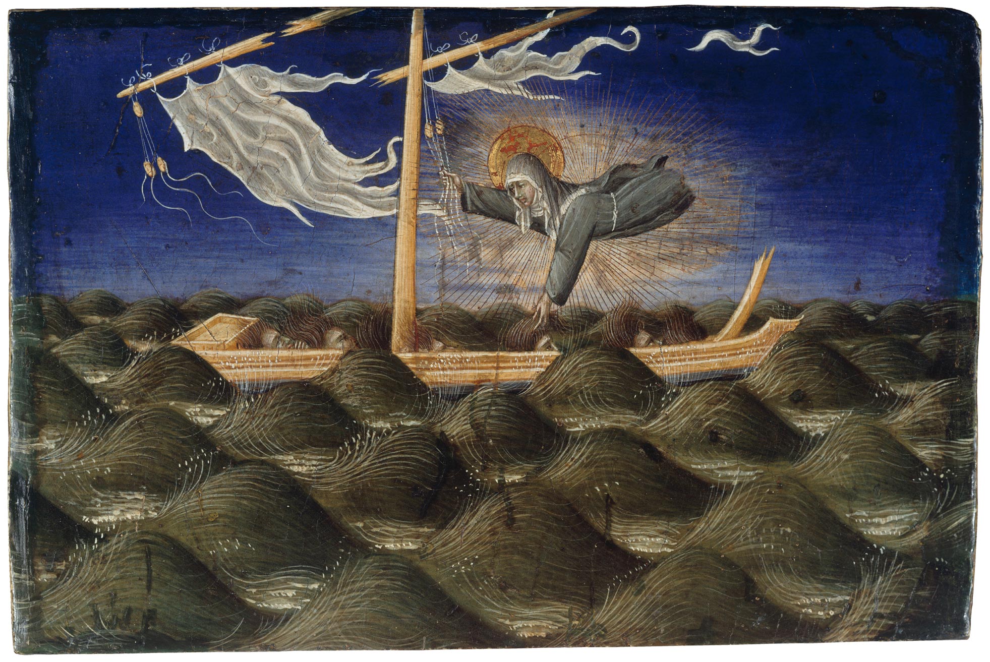 Recognizing the correct subject of the Jarves panel, Pope-Hennessy also asserted that it formed part of a suite of four predella panels illustrating episodes from the life or posthumous miracles of Saint Clare. The first in narrative sequence (fig. 1) was at that time in the Fuld collection in Frankfurt; subsequently acquired in 1940 by the Kaiser Friedrich Museum in Berlin, it was restituted to the heirs of the Fuld family, sold at Christie’s in London in 2019, and is now in a private collection in New York.3 It represents the investiture of the young Saint Clare by Saint Francis at the shrine of Santa Maria degli Angeli in Assisi. Following this scene in the predella was the Jarves Blessing the Bread: a split through the left half of the panel at Yale, just above the center of the composition, continues into the right edge of the ex-Fuld Investiture. These two episodes from the life of Saint Clare were balanced on the right side of the predella by two posthumous miracles. The first was a scene of Saint Clare rescuing a shipwrecked crew at sea (fig. 2). Also formerly in the Fuld collection, and sold alongside its companion scene of the investiture,4 this panel, too, is now in a private collection in New York. The shipwreck scene is one of Giovanni di Paolo’s most imaginative and fantastic depictions of a miraculous event and, together with its extraordinary state of preservation, is one of the most compelling images in his entire oeuvre. It was followed in the predella by a scarcely less imaginative but sadly overcleaned panel now in the Museum of Fine Arts, Houston, representing Saint Clare rescuing a child attacked by a wolf (fig. 3). It may be presumed either that further scenes from the life of Saint Clare are missing or that the two known pairs of scenes were separated from each other by a Crucifixion or another scene from the life of Christ, as is typical in the predellas of Sienese altarpieces from the fifteenth century.