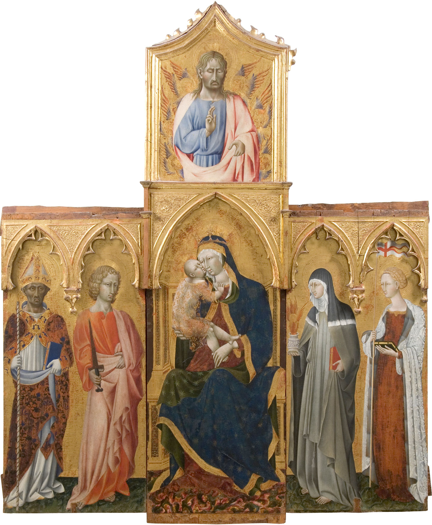 Assuming that the four Saint Clare panels functioned as the predella to an altarpiece, Carl Strehlke accepted a suggestion offered to him by Keith Christiansen that this might have been Altarpiece 191 in the Pinacoteca Nazionale, Siena, representing the Virgin and Child Enthroned with Saints Peter Damian, Thomas, Clare, and Ursula (fig. 4).5 He observed that the works correspond to each other in style and that the widths of the lateral panels in the altarpiece closely approximate those of the individual predella scenes. One other Clarissan altarpiece by Giovanni di Paolo—representing Saint Nicholas Enthroned with Saints Bernardino, Francis, Clare, and Louis of Toulouse—while also related in style is considerably larger (251 cm wide, as compared to 183 cm wide) and less plausible a source for the predella.6 In both of these altarpieces, Saint Clare stands immediately to the right of the center panel rather than in the conventional place of honor on the left, leading Carolyn Wilson to reject the idea that either might be reconstructed as part of a single complex with the Saint Clare scenes.7 This convention seems not to have been observed rigidly either by Giovanni di Paolo or his patrons. A predella including four scenes from the life of Saint John the Baptist now in the National Gallery, London,8 has reasonably been associated with an Augustinian altarpiece at the Metropolitan Museum of Art, New York,9 in which the Baptist similarly stands on the right. Wilson’s alternative suggestion that the scenes may have formed part of a custodia or vita retable is unlikely given their size, the horizontal wood grain of their supports, and the apparent continuity of those panel supports.