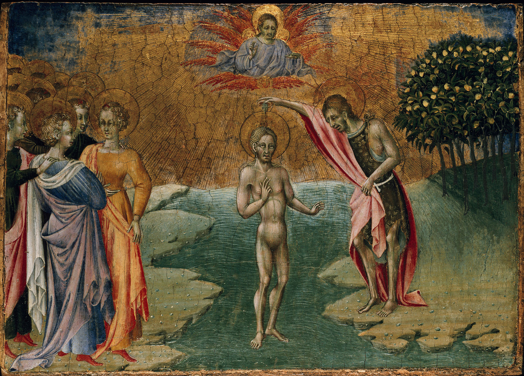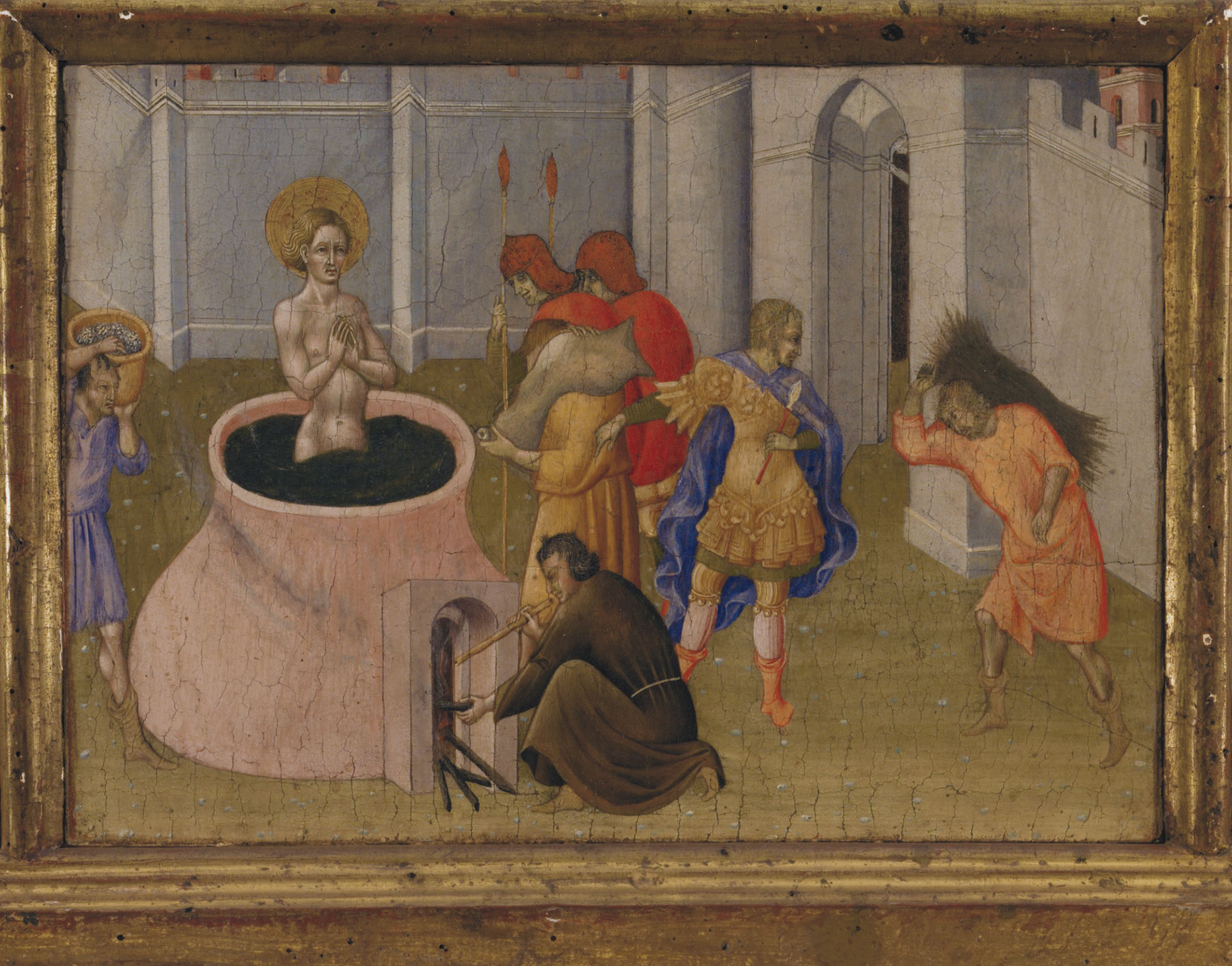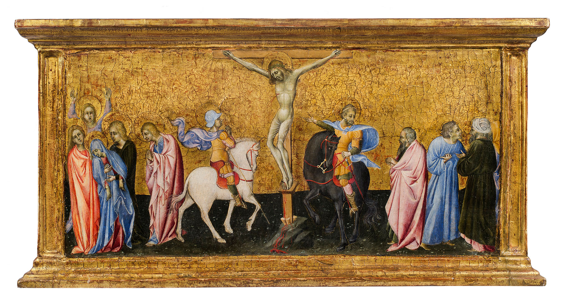 These two panels were, until recently, known to most students of Giovanni di Paolo’s work only from their description in Francesco Brogi’s 1862 inventory of the former Silvestrine church of San Giovanni del Poggiolo in Montepulciano: “La Vergine Annunziata è seduta posando le mani sul petto. Figura grande circa un quarto del vero, dipinta a tempera con fondo d’oro. Tavola acuminata nella parte superiore, alta 1,06 larga 0,42. L’Angelo Annunziante genuflesso col ginocchio sinistro, tiene nella mano destra un ramo d’olivo. Figura e tavola simile alla precedente. Secolo XV. Giovanni di Paolo. Scuola Senese” (The Virgin Annunciate is seated, her hands crossed on her chest. The figure is about one quarter life size, painted in tempera on a gold ground. A pointed panel, 106 centimeters high, 42 centimeters wide. The Annunciatory Angel, genuflecting on his left knee, holds an olive branch in his right hand. Figure and panel similar to the preceding. XV century. Giovanni di Paolo. Sienese school). Hanging alongside them in the sacristy of the church were three predella panels also by Giovanni di Paolo, described by Brogi as “San Giovanni Battista nel Giordano batteza Gesù: a sinistra vedonsi quattro discepoli, ed altri nell’indietro. Nella gloria vi è Iddio Padre. Piccole figure dipinte a tempera sulla tavola con fondo d’oro, alta 0,29, larga 0,36” (Saint John the Baptist baptizing Christ in the Jordan: at the left are four disciples with others behind. In a glory above is God the Father. Small figures painted in tempera on the panel with a gold ground, 29 centimeters high, 36 centimeters wide); “La Crocifissione di Gesù Cristo. Ai lati della Croce stanno due giudei a cavallo; a sinistra vi è la Vergine svenuta, retta dalle Marie, e appresso San Giovanni; a destra vi sono tre altre figure. Tavola dipinta a tempera, fondeggiata in oro, alta 0,29 larga 0,54” (The Crucifixion of Jesus Christ. Alongside the Cross are two Jews on horseback; at the left, the Virgin faints and is supported by the Marys, with Saint John nearby; at the right are three other figures. A panel in tempera, with a gold ground, 29 centimeters high, 54 centimeters wide); and “San Giovanni Apostolo dentro una caldaia d’olio. Vedesi un manigoldo alimentare il fuoco, un altro portare una fascina, e tre spettatori del martirio. Piccole figure dipinte a tempera con fondo a colore. Tavola alta 0,29 larga 0,36—alcune teste sono deturpate” (Saint John the Apostle in a cauldron of oil. An executioner stokes the flames, another carries a bundle of kindling, and three spectators witness the martyrdom. Small figures painted in tempera against a colored ground, a panel 29 centimeters high, 36 centimeters wide—some of the heads are ruined).2