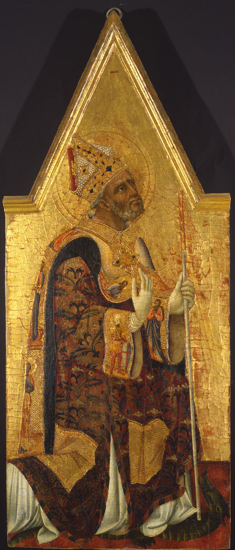 Keith Christiansen supposed this panel, the subject of which he correctly identified as Saint Donatus, to have been a companion to Pinacoteca Nazionale, Siena, no. 215 (see Torriti, Piero. La Pinacoteca Nazionale di Siena. Vol. 1, I dipinti dal XII al XV secolo. Genoa: Sagep, 1977., 308), representing Saint Andrew; see Christiansen, Keith. “Notes on Painting in Renaissance Siena.” Burlington Magazine 132, no. 1044 (March 1990): 205–13., 207n6. The latter has been cropped on all four sides but does seem to portray the saint kneeling and employs the same punch decoration to define his halo. Marrone rejects the association of the Saint Donatus with the Saint Andrew, which he believes came from a different altarpiece datable as much as a decade later; see Marrone, in Bagnoli, Alessandro, ed. Il Sassetta e il suo tempo: Uno sguardo sull’arte senese del primo quattrocento. Exh. cat. Florence: Centro Di, 2024., 208–15. Of these two proposals, Christiansen’s seems the more likely to be correct. Both Marrone and Christiansen believed that the Saint Donatus and Saint Andrew were altarpiece laterals, not pinnacles, on the analogy of two panels by Sano di Pietro then recently discovered, representing kneeling figures of Saints Ansanus and Francis. Andrea De Marchi posited an altarpiece reconstruction in which these latter appear as pinnacles, not laterals; see De Marchi, in Seidel, Max, Francesco Caglioti, Elian Carrara, et al., eds. Le arti a Siena nel primo Rinascimento: Da Jacopo della Quercia a Donatello. Exh. cat. Milan: Federico Motta, 2010., 272–75. ↩︎