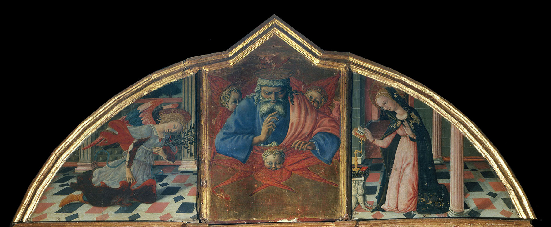 Gallerie degli Uffizi, Florence, inv. nos. 1890 nn. 451–53, https://www.uffizi.it/en/artworks/annunciation-with-st-margaret-and-st-ansanus. ↩︎