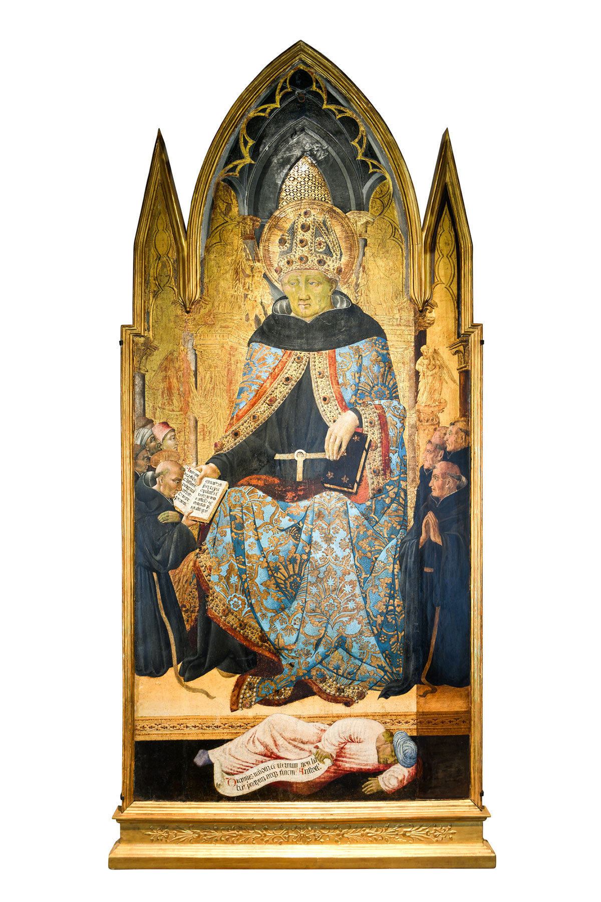 Piero Torriti tentatively identified this figure as Saint Nicholas of Bari; see Torriti, Piero. La Pinacoteca Nazionale di Siena. Vol. 1, I dipinti dal XII al XV secolo. Genoa: Sagep, 1977., 322. The saint kneels on a dragon and must be presumed to represent Donatus. Raffaele Marrone identified the figure as Donatus and noted its identity of size to the ex-Montepulciano Annunciation panels now at Yale; see Marrrone, in Bagnoli, Alessandro, ed. Il Sassetta e il suo tempo: Uno sguardo sull’arte senese del primo quattrocento. Exh. cat. Florence: Centro Di, 2024., 208–11. ↩︎